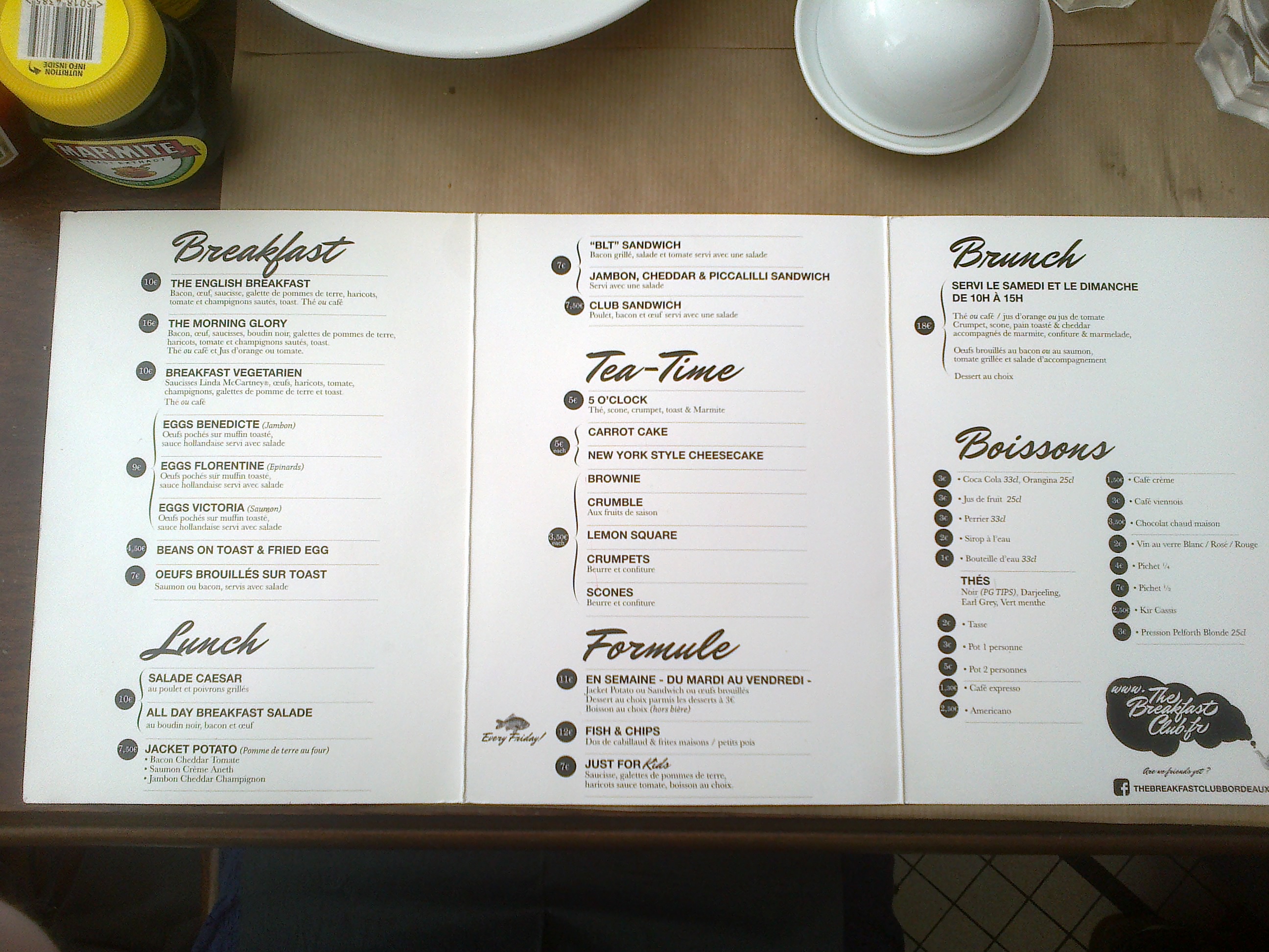 Nos pas nous ont mené au Breakfast Club situé plus ou moins dans le quartier Saint Pierre. L’endroit est tout petit, décoré d’un côté avec des posters et un grand miroir avec les bras de Popeye de l’autre. L’endroit propose des brunchs et toutes sortes de repas légers typiques de la gastronomie anglaise. D’ailleurs ce resto fait aussi salon de thé et propose une offre à 5€ comprenant : thé, scones, crumpet, toast et Marmite!
