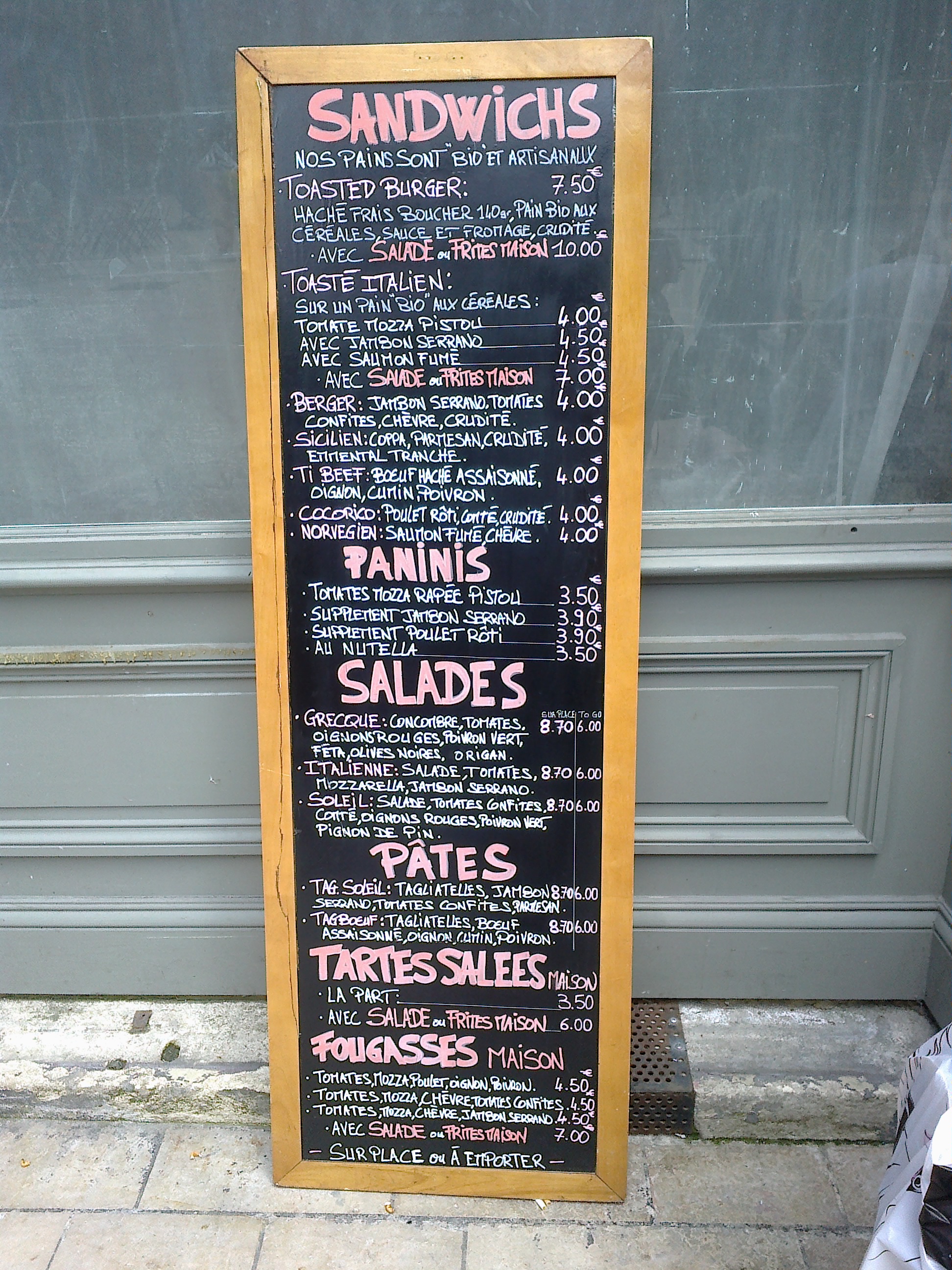 « Pain de soleil » propose plein d’autres choses pour manger sur le pouce pour environ 4€ : des sandwichs toastés ou froid, des pâtes, des tartes, des fougasses, des burgers… Ils ont des formules pour tout pour ! On retrouve les desserts classiques (flan, fondant au chocolat éclair…) à très petits prix ! Pas plus de 2,5€ ! Certes ce n’est pas très recherché, mais c’est la qualité appréciable et on a ce qu’il faut pour se caler l’estomac sans excès. Si vous n’avez pas la météo de votre côté, ce n’est pas grave, il y a une salle à l’étage peinte dans des tons vifs qui remplaceront aisément le soleil absent ! Une adresse sympathique pour un déjeuner rapide, sans prétention, ni prise de tête.