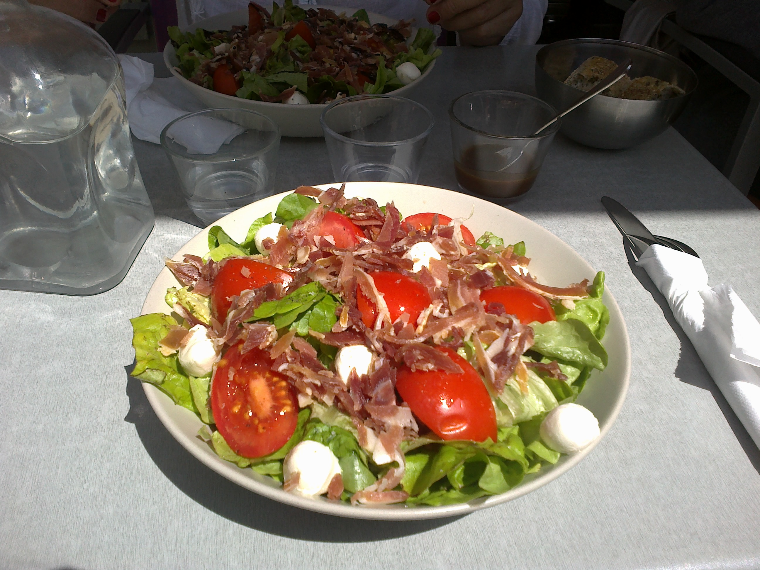 Une serveuse très gentille nous accueille. Au lieu d’une carte dans un format standard, elle nous apporte carrément le panneau de menu plus grand qu’elle à côté de notre table pour que nous puissions faire notre choix. Sans concertation, ma mère et moi choisissons la même chose : une salade italienne à base de mozzarella, jambon de parme et tomates.