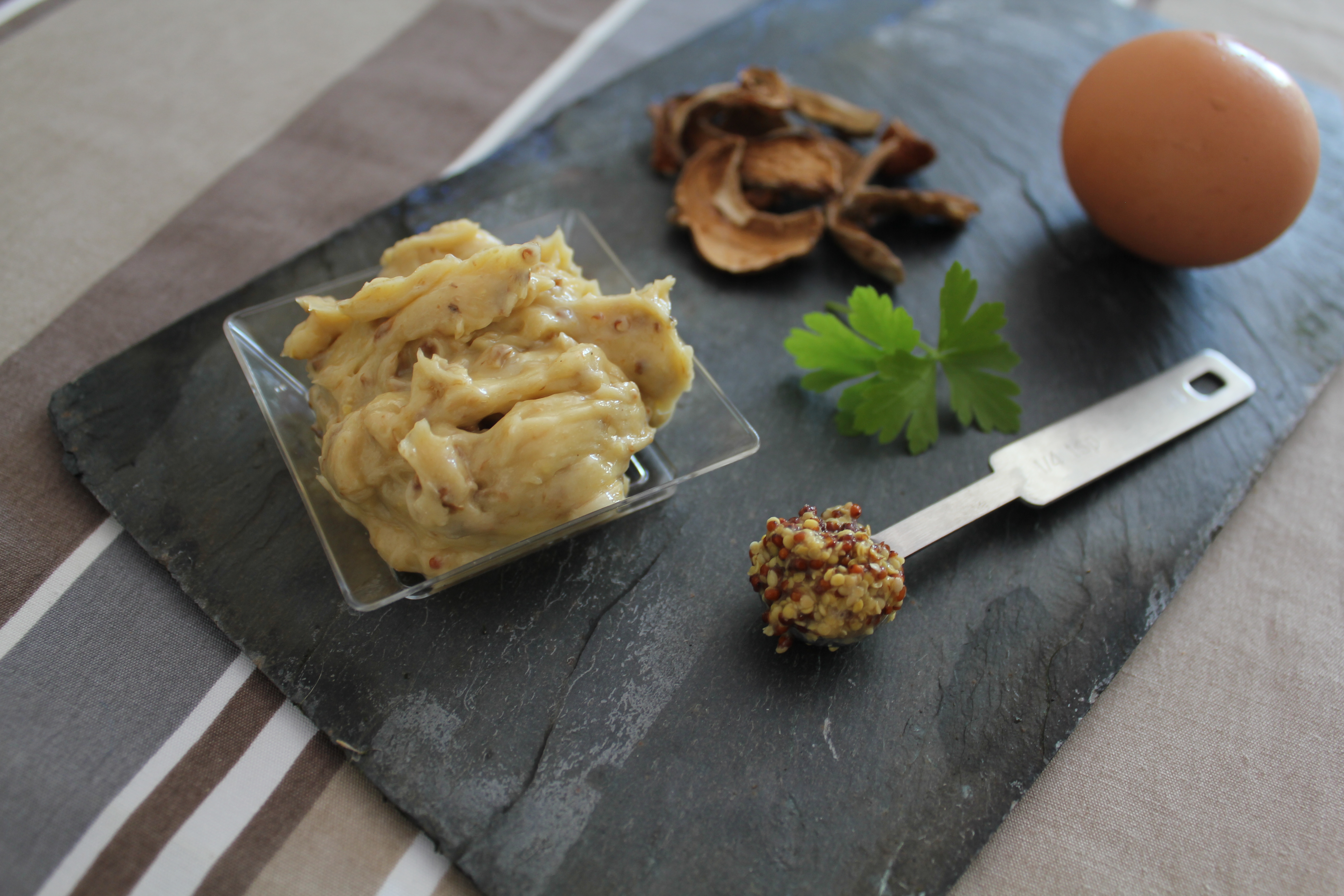 Pour un goût de cèpes et de fumé/boisé encore plus prononcé faites réduire un peu le jus de trempage des cèpes et incorporez-en 1 cac ou 1cas à votre mayonnaise lors de l’étape 2 avec le jaune d’œuf.