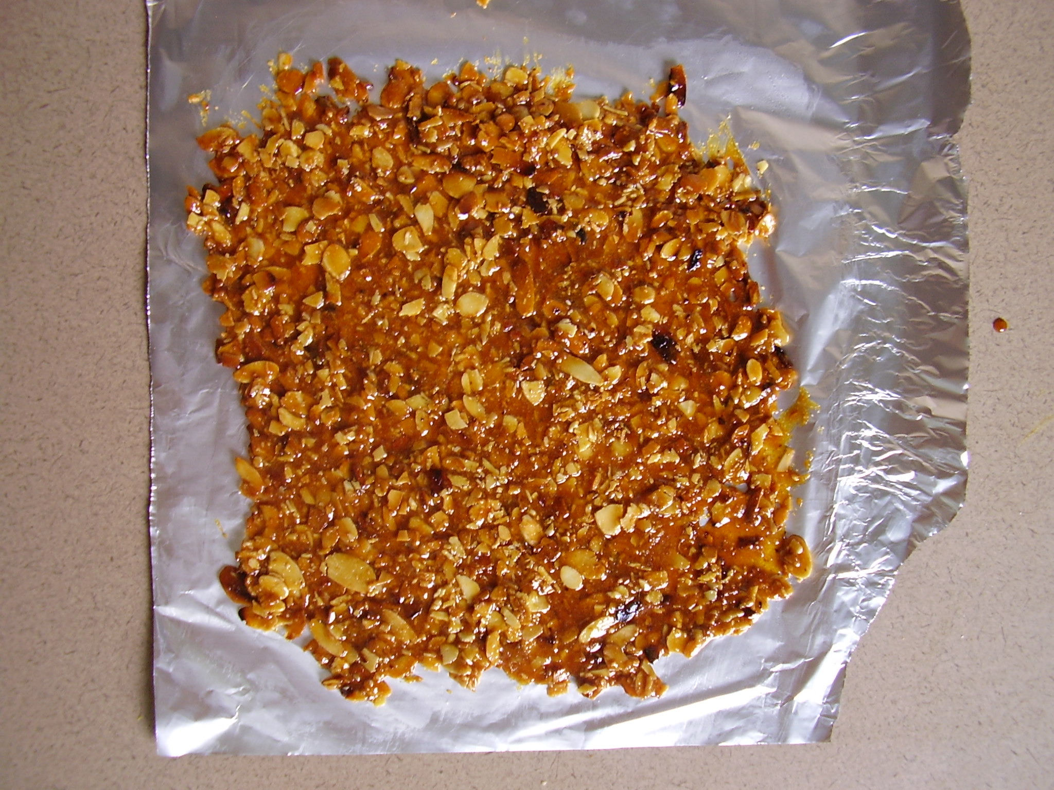 - Coulez le mélange sur l’aluminium graissé. Etalez à l’épaisseur que vous souhaitez. Laissez refroidir.