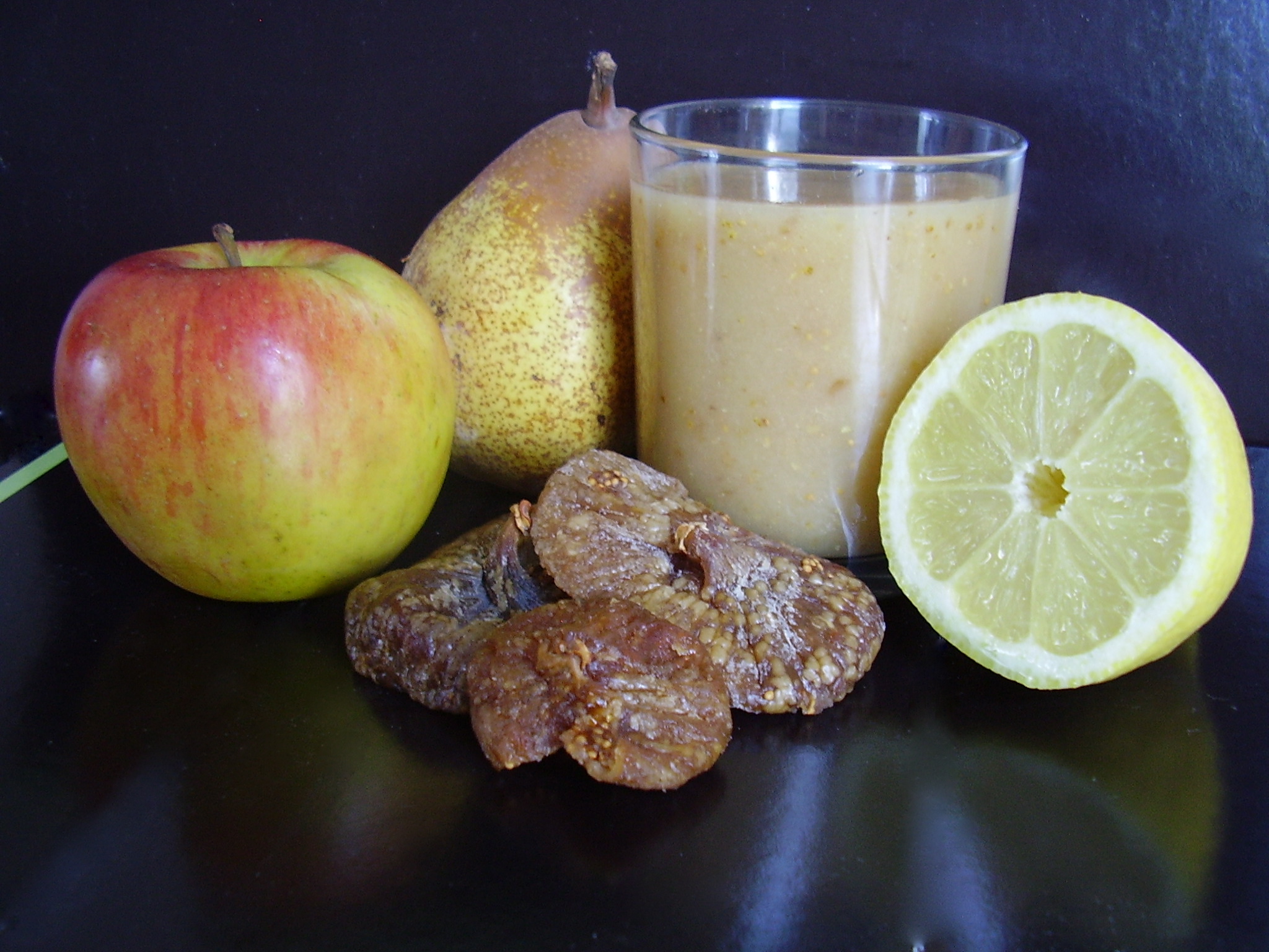 J’étais en train de perdre une poire, alors j’ai cherché à l’utiliser en smoothie. Comme mon petit déjeuner n’avait pas été très copieux, j’ai rajouté des figues pour un meilleur apport en énergie. Du jus de pomme pour la fluidité. Et un tout petit peu de jus de citron pour la touche acidulée et éviter que cela ne noircisse trop.