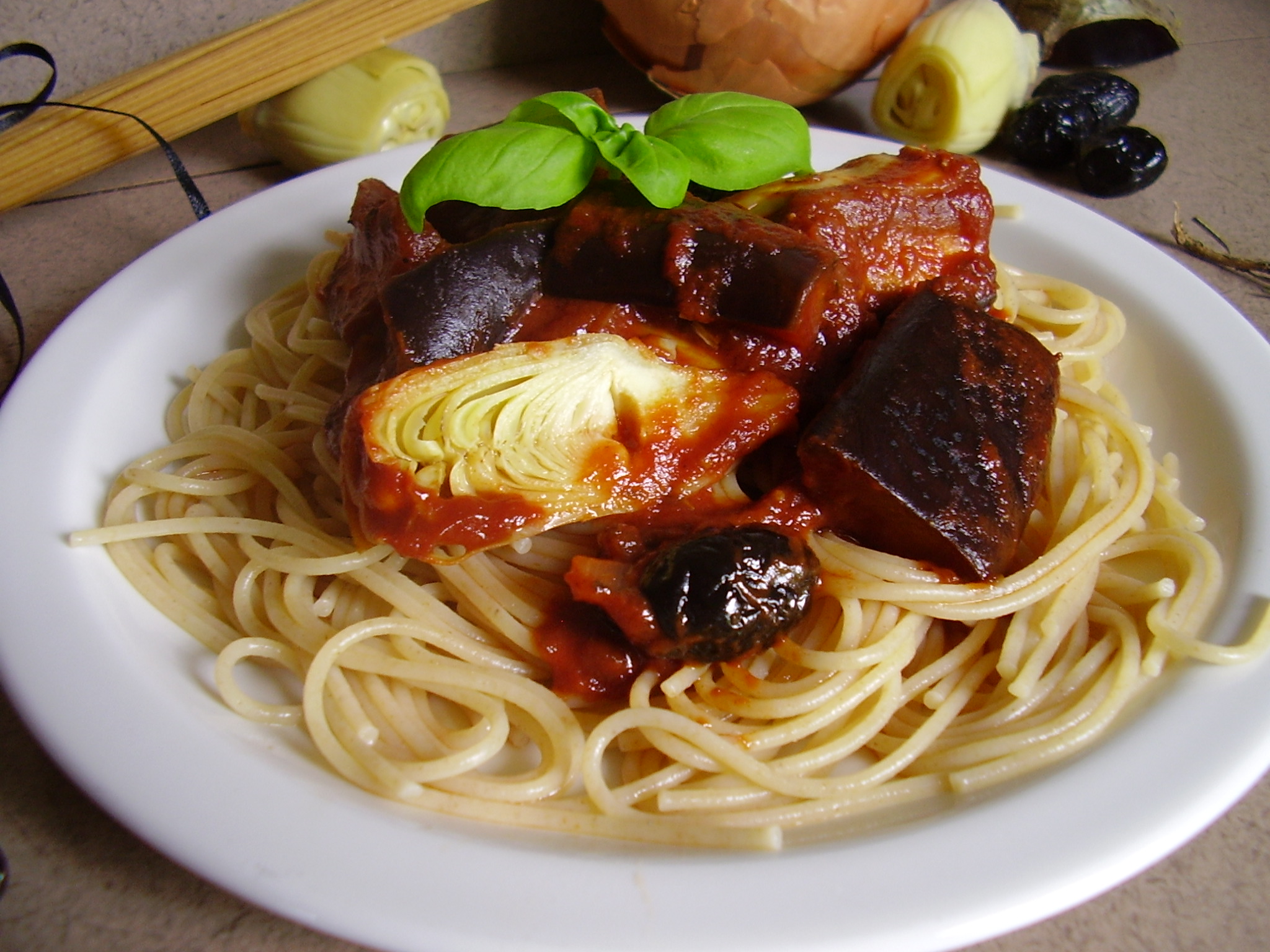 Voilà une jolie manière de manger des légumes. C’est une préparation légère et qui a beaucoup de goût. Elle ne s’appelle pas « spaghettis à la méditerranéenne » par hasard. Cette recette ne contient que des légumes typiques de la gastronomie du sud : aubergine, artichaut, tomate et olives ! Cela fait un beau cocktail de vitamines rassasiant prêt en une petite demi-heure.