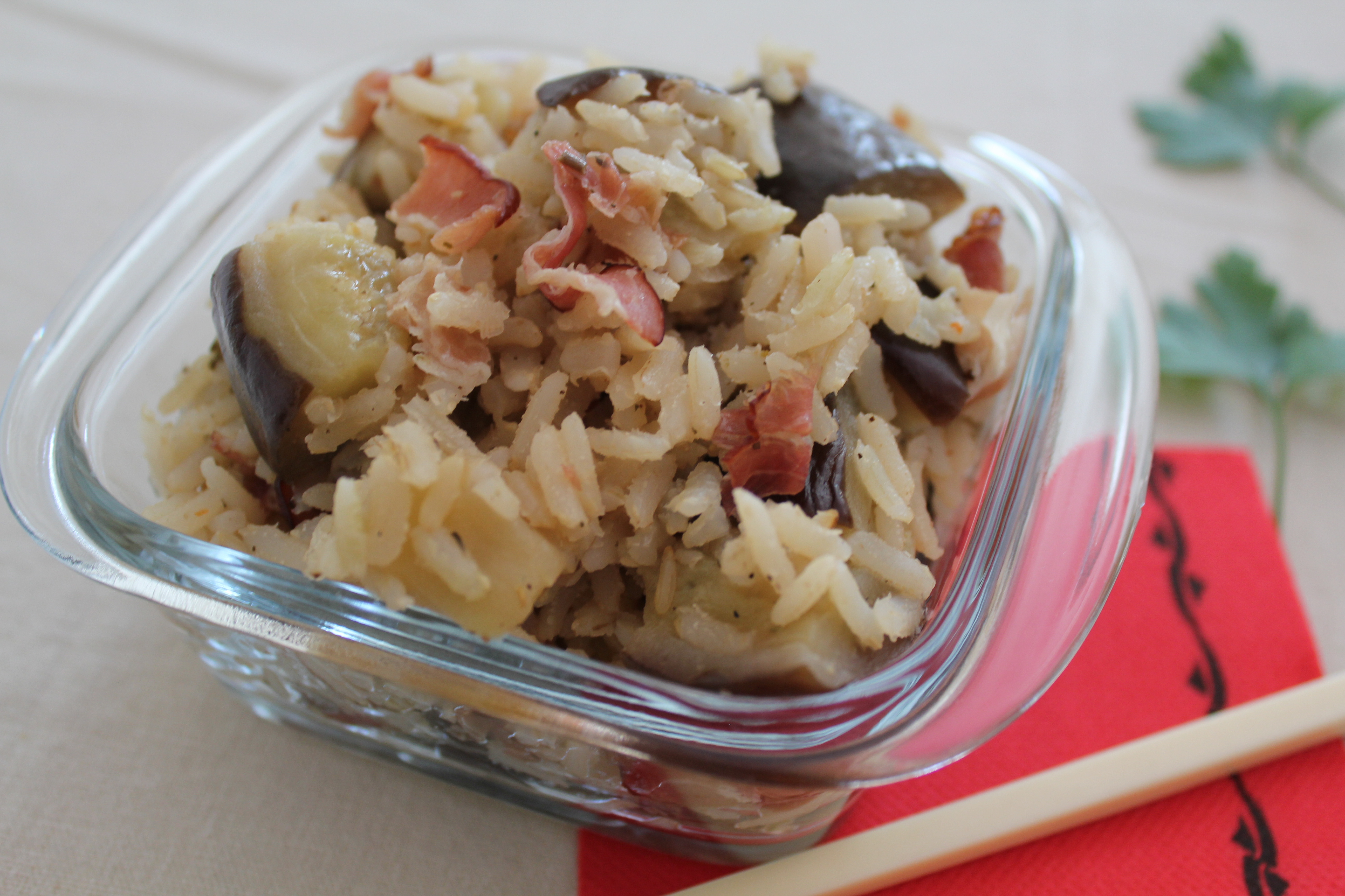 Comme mon riz était déjà cuit au préalable, je ne me suis pas embêtée à le refaire cuire dans l’huile d’olive. J’ai fait revenir directement mon échalote, puis les aubergines avec la poitrine fumée. Ensuite j’ai ajouté le riz et les liquides les uns après les autres comme pour un risotto classique.