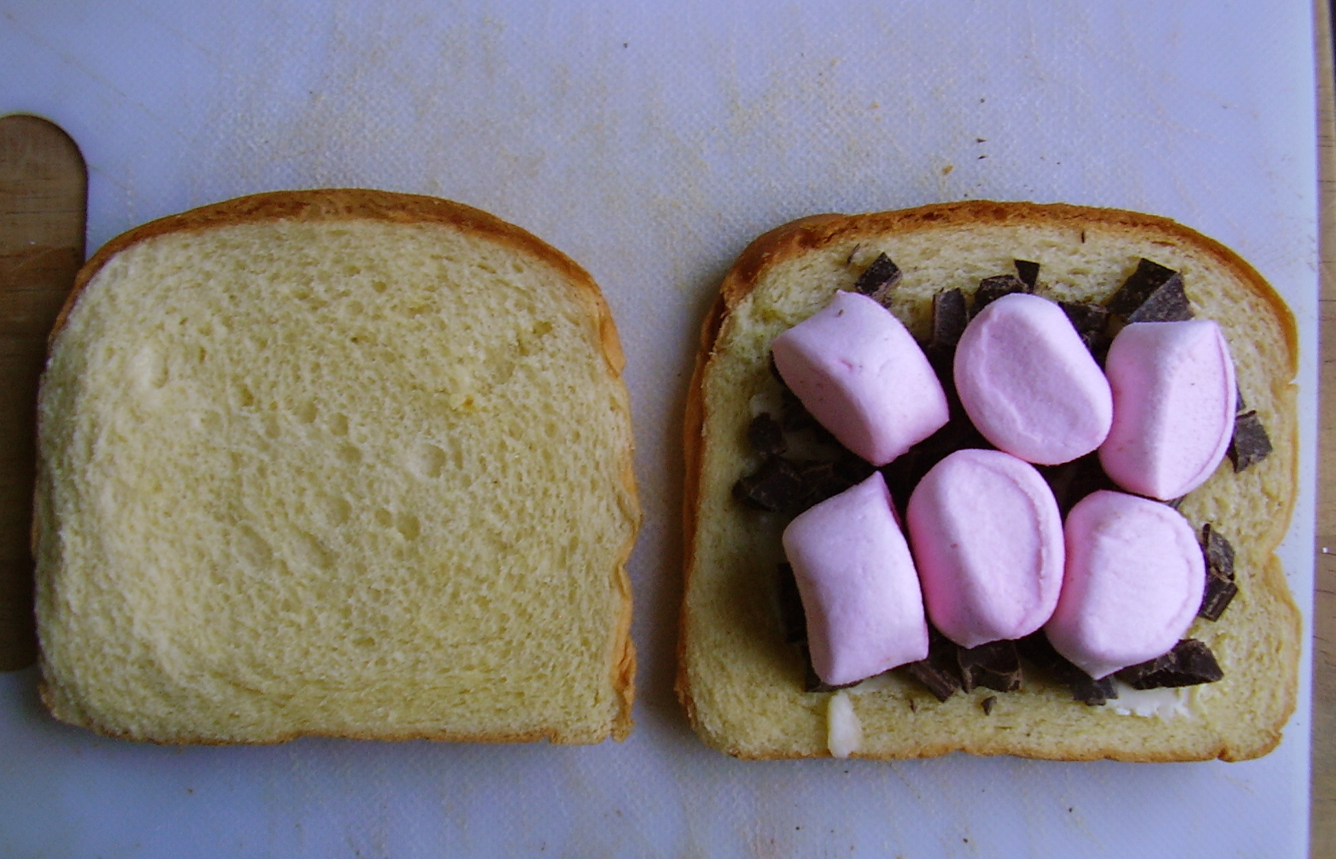 - Sur une face de pain non beurrée, répartissez la moitié du chocolat haché, puis 6 (ou 8) demi-marshmallow.