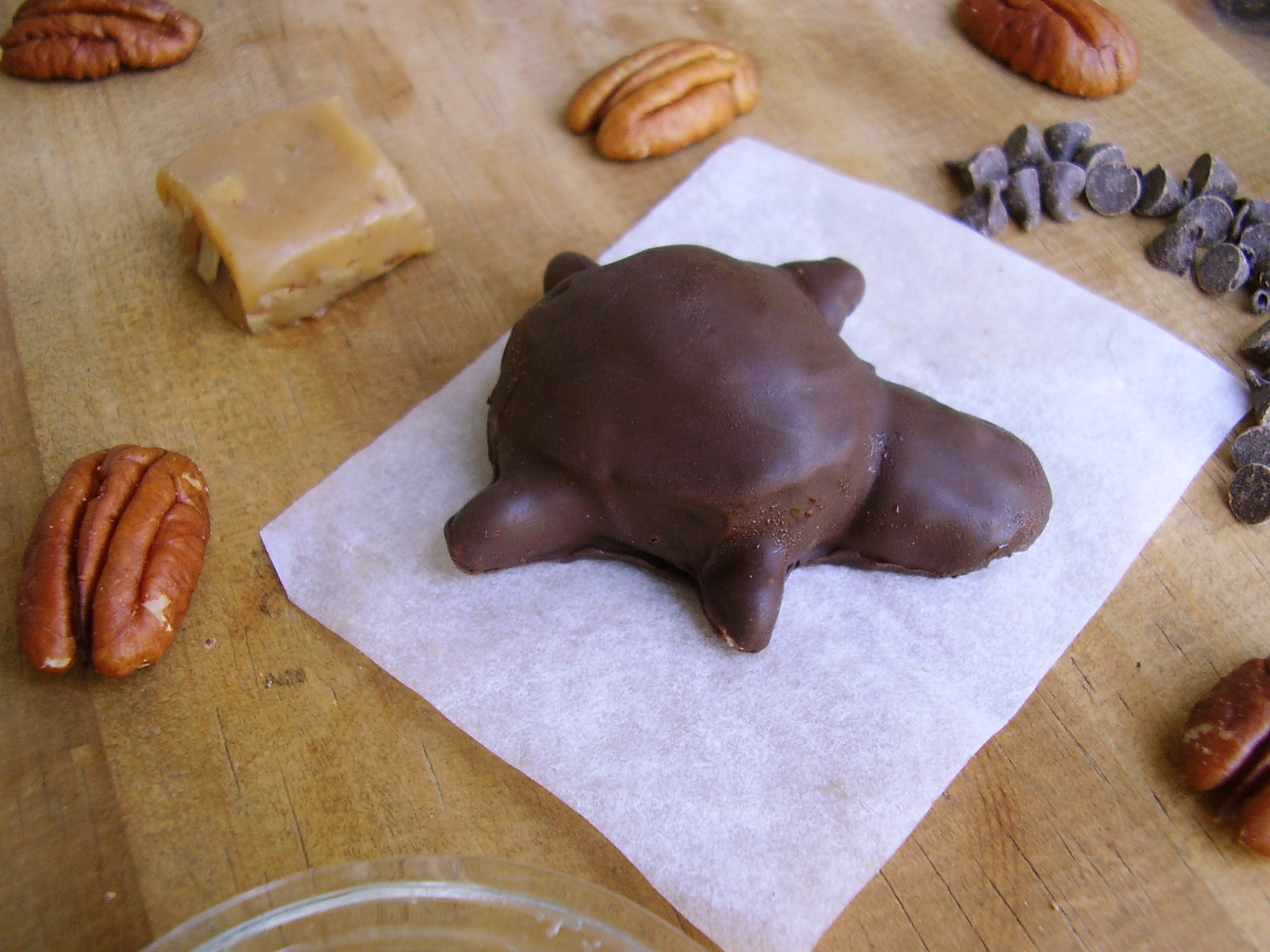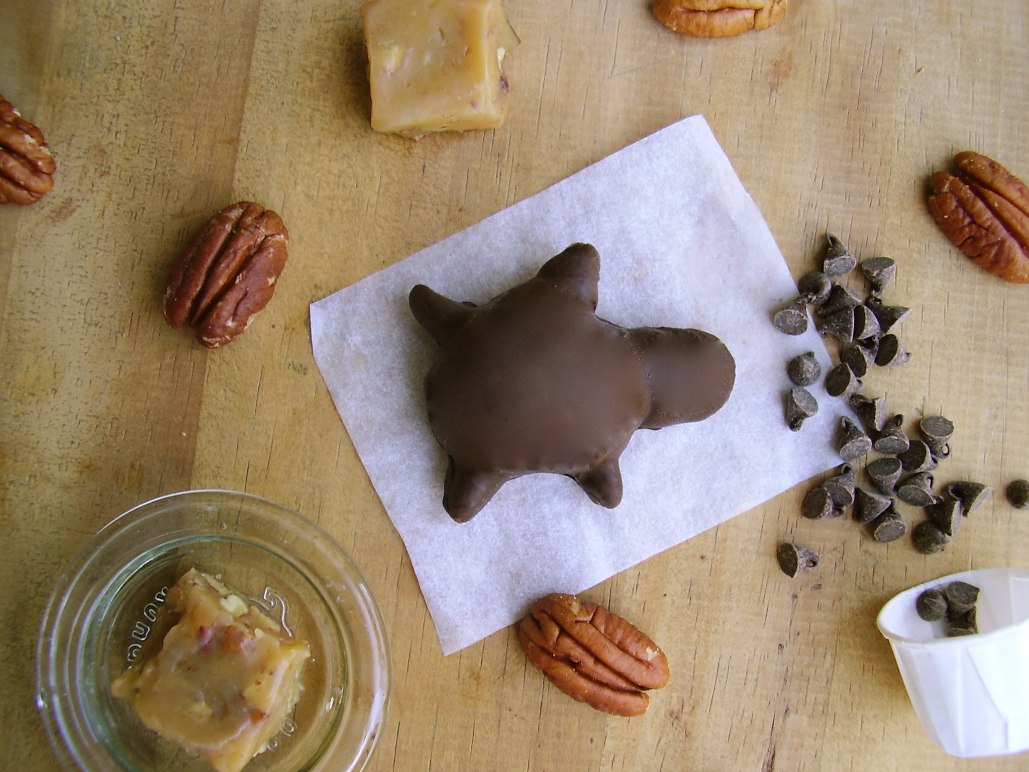 11. Attrapez délicatement une tortue en caramel et plongez-la dans le chocolat fondu. Ressortez-là doucement et laissez-là s’égoutter sur une grille.