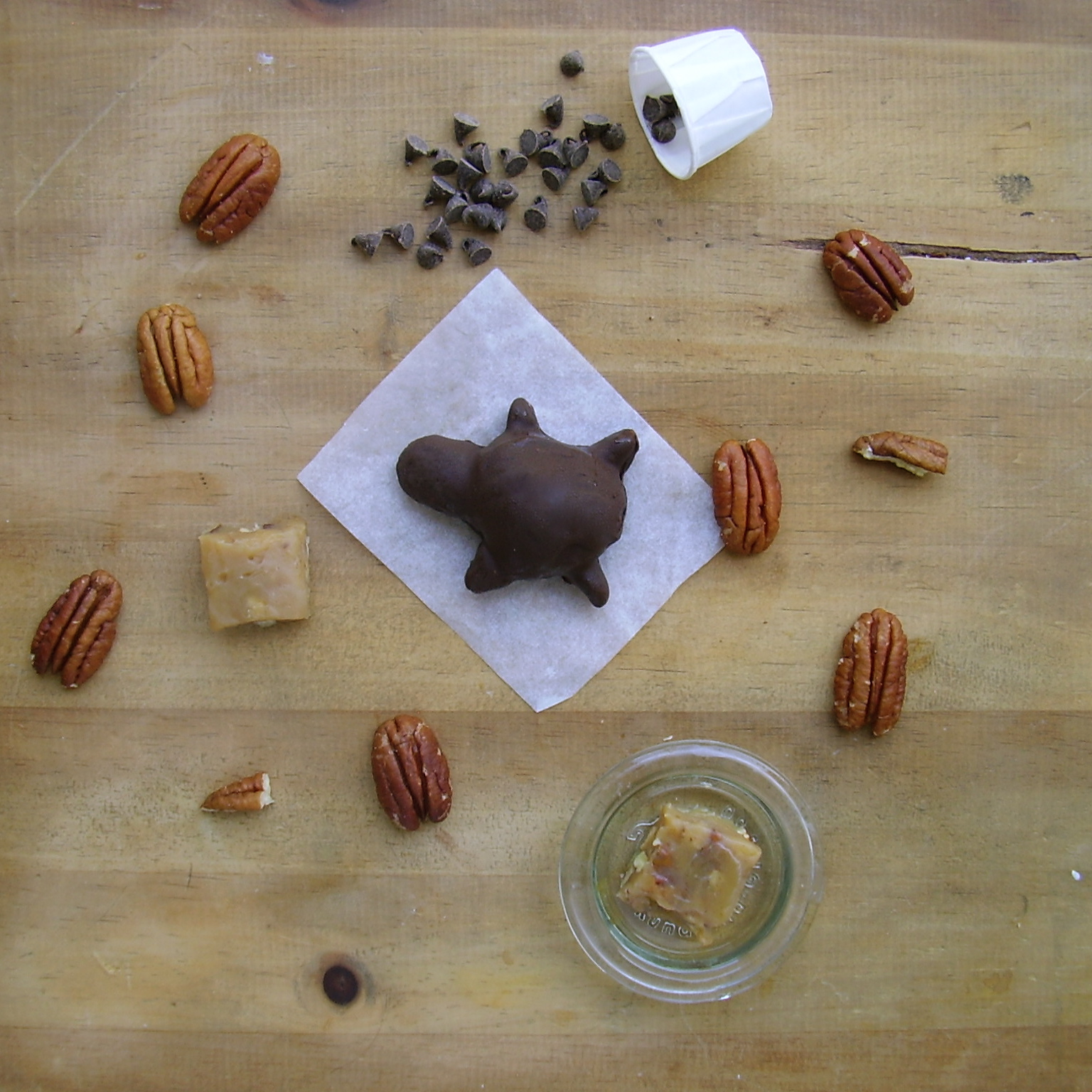 8. Enfoncez une noix de pécan entière dans le caramel pour la tête et 4 demi cerneaux de chaque côté pour les pattes.