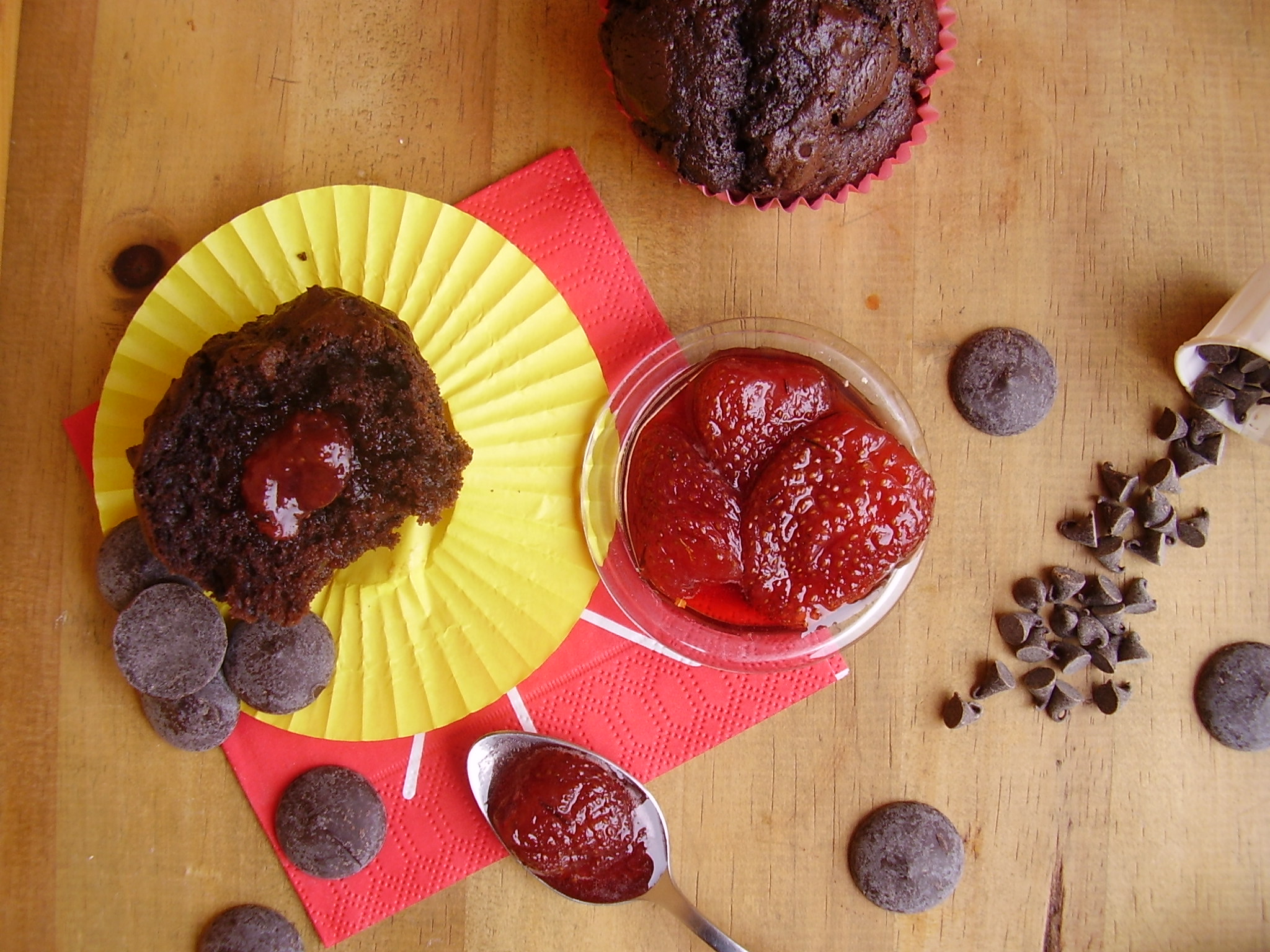 Il y a un petit moment déjà je vous avais présenté une recette de fraises confites. Je les ai utilisées dans ces muffins tout chocolat pour faire un coeur fondant et délicieusement épicé.