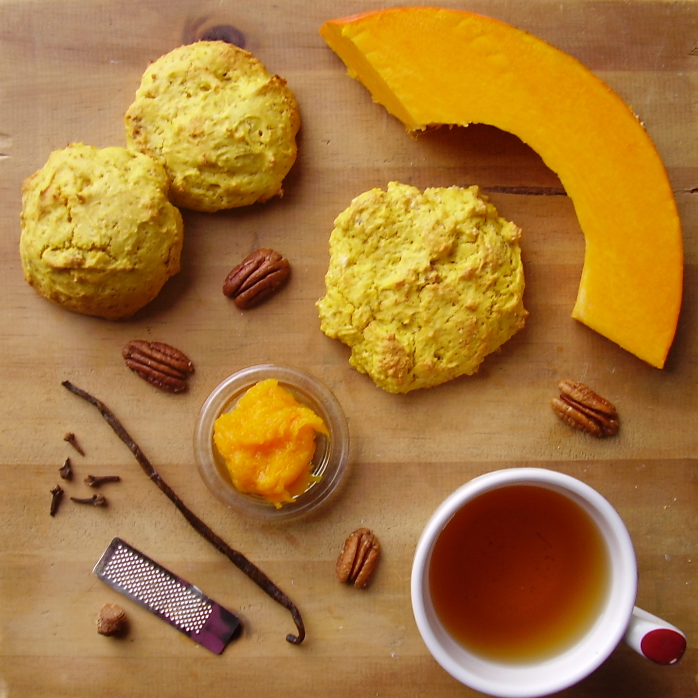 Cela faisait bien longtemps que je ne vous avais pas proposé de recettes de scones! Et je vous avais aussi promis des recettes à base de potiron qui changent de la soupe ! En voici donc une à la saveur douce et hivernale, assez peu sucrée. J’adore les noix de pécan qui apporte un délicieux croquant! Sans compter la texture moelleuse et la belle couleur jaune-orangée !