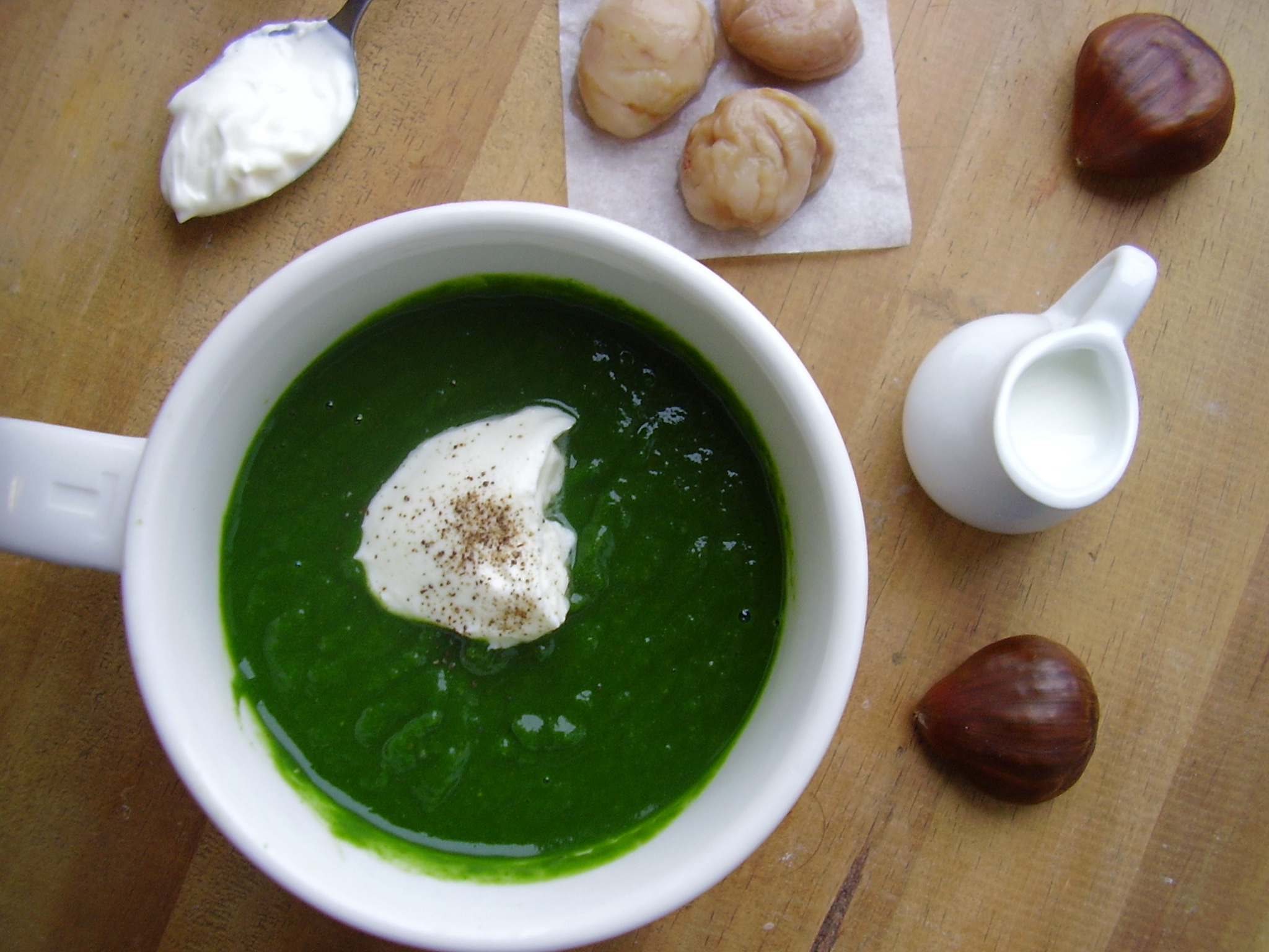 Une soupe terriblement onctueuse et d’un très beau vert émeraude. Préparée avec des épinards congelés, cette soupe vous prendra à peine 15 minutes! Plutôt que de choisir les traditionnelles pommes de terre pour lier cette soupe, j’ai préféré des marrons. Cependant, on les sent assez peu. En tout cas, c’est une vrai douceur sur la langue!