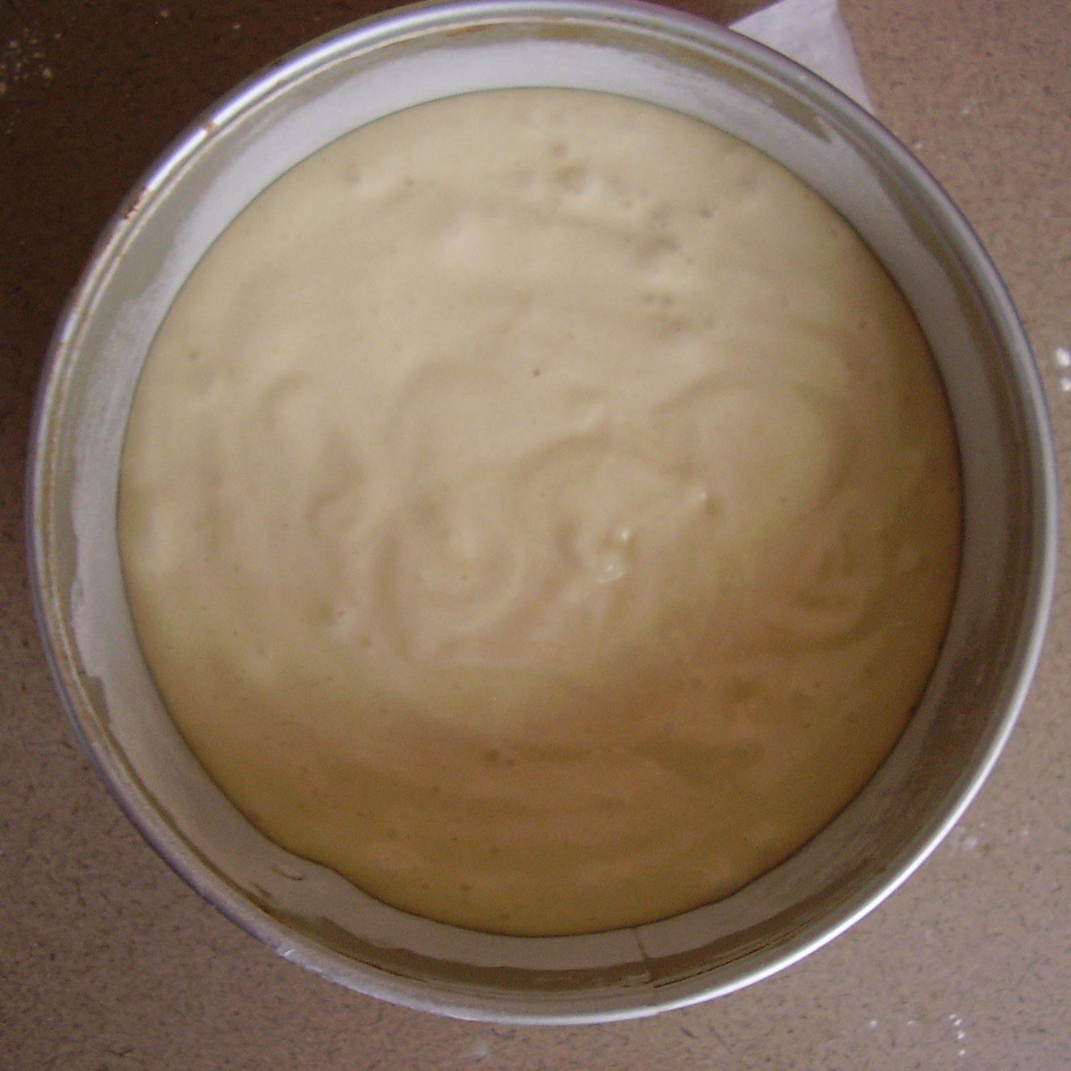 - Versez toute la pâte dans un moule de 18cm de diamètre et après cuisson de 40 à 45min, coupez ce gâteau en 3 à l’aide d’une grande lyre ou d’un couteau à pain.