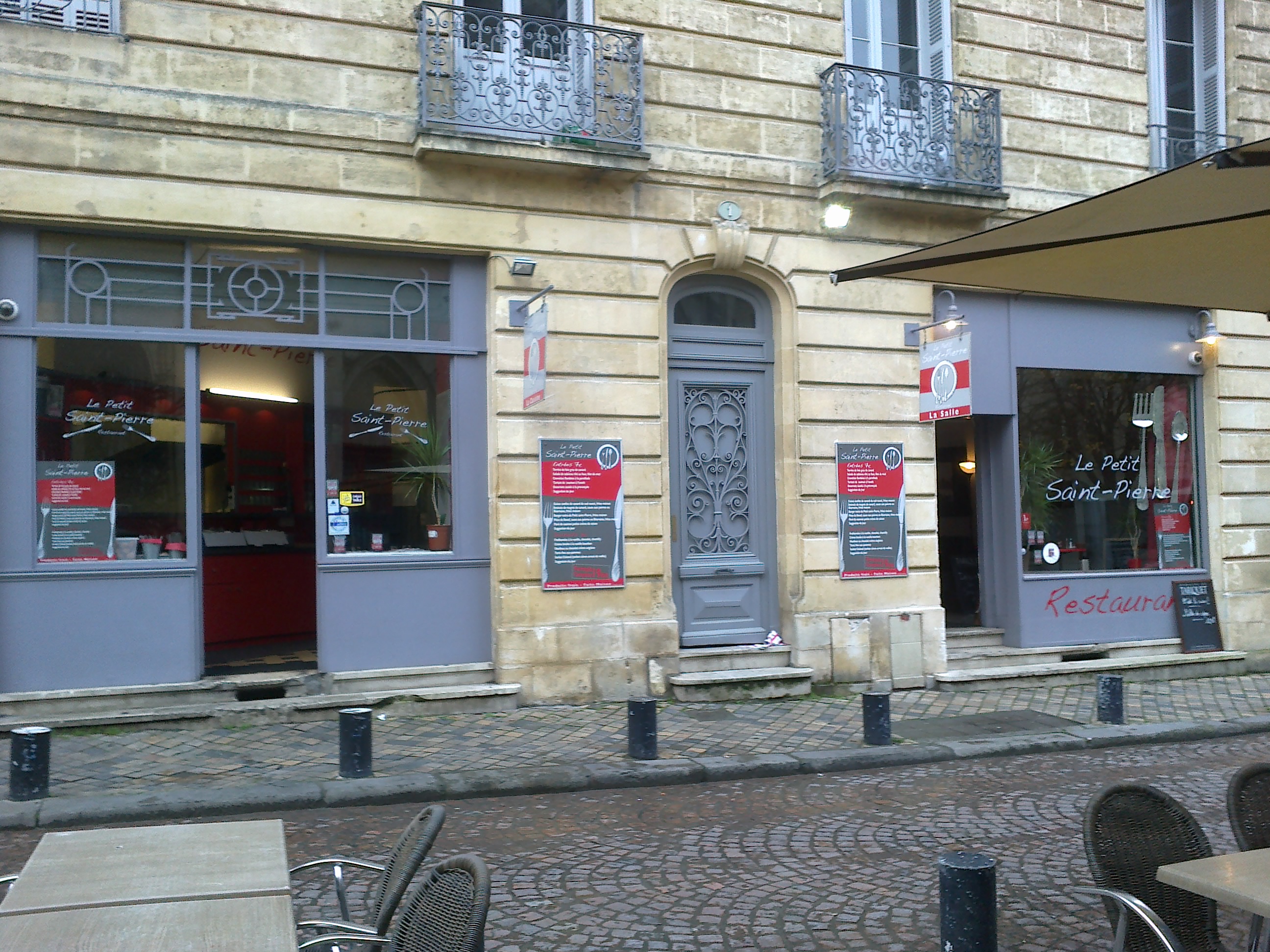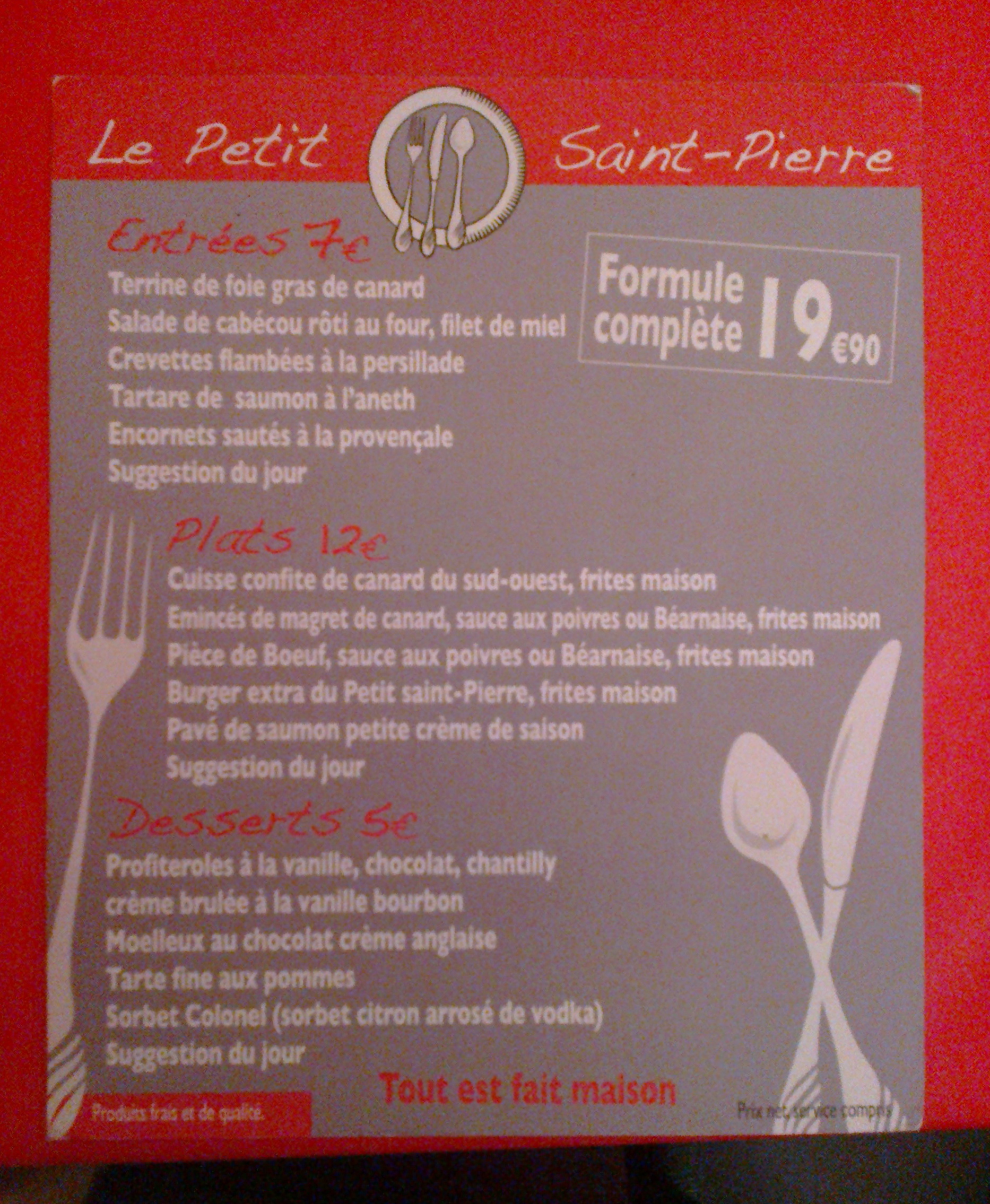Le soir de mon anniversaire, après une petite promenade sous le crachin au marché de Noël place Tourny, mon copain et moi sommes allés manger au restaurant Le Petit Saint Pierre situé sur la place du même nom, au coeur d’un des quartiers historiques de Bordeaux.201220142942171220142927L’endroit est assez particulier. En effet, le restaurant est coupé en deux parties : d’un côté les cuisines avec les toilettes et de l’autre, la salle de restauration. Au moins, on n’est pas dérangé par la chaleur, ni les odeurs de la cuisine. Ils bénéficient également d’une terrasse, au pied de l’église, couverte par des parasols et chauffée. La décoration ne paie pas de mine, et c’est peut-être le seul bémol que j’aurais a apporter à ce restaurant. C’est vraiment très sobre, limite dépouillé. Les chaises sont en bois, pas très sophistiquées mais les banquettes en cuir sont confortable. Les tons sont crème et rouge, quelques rares tableaux affichés au mur, un sol entre carrelage et parquet, quelques plantes réparties le long de la vitrine. Un mélange qui manque d’étude et d’uniformité, mais qui n’empêche pas l’endroit d’être agréable. Le fond musical était vraiment très discret, avec des musiques variées.