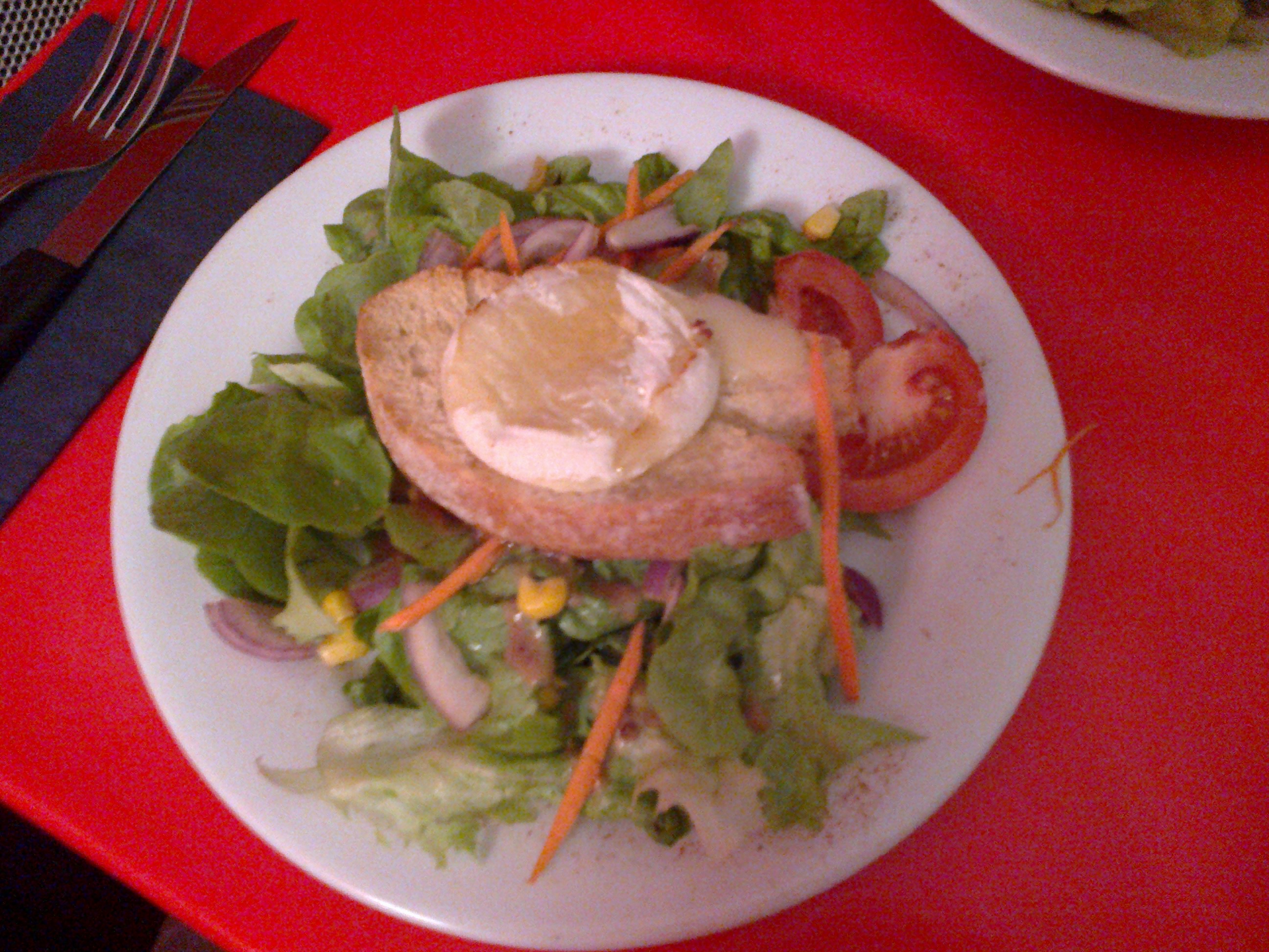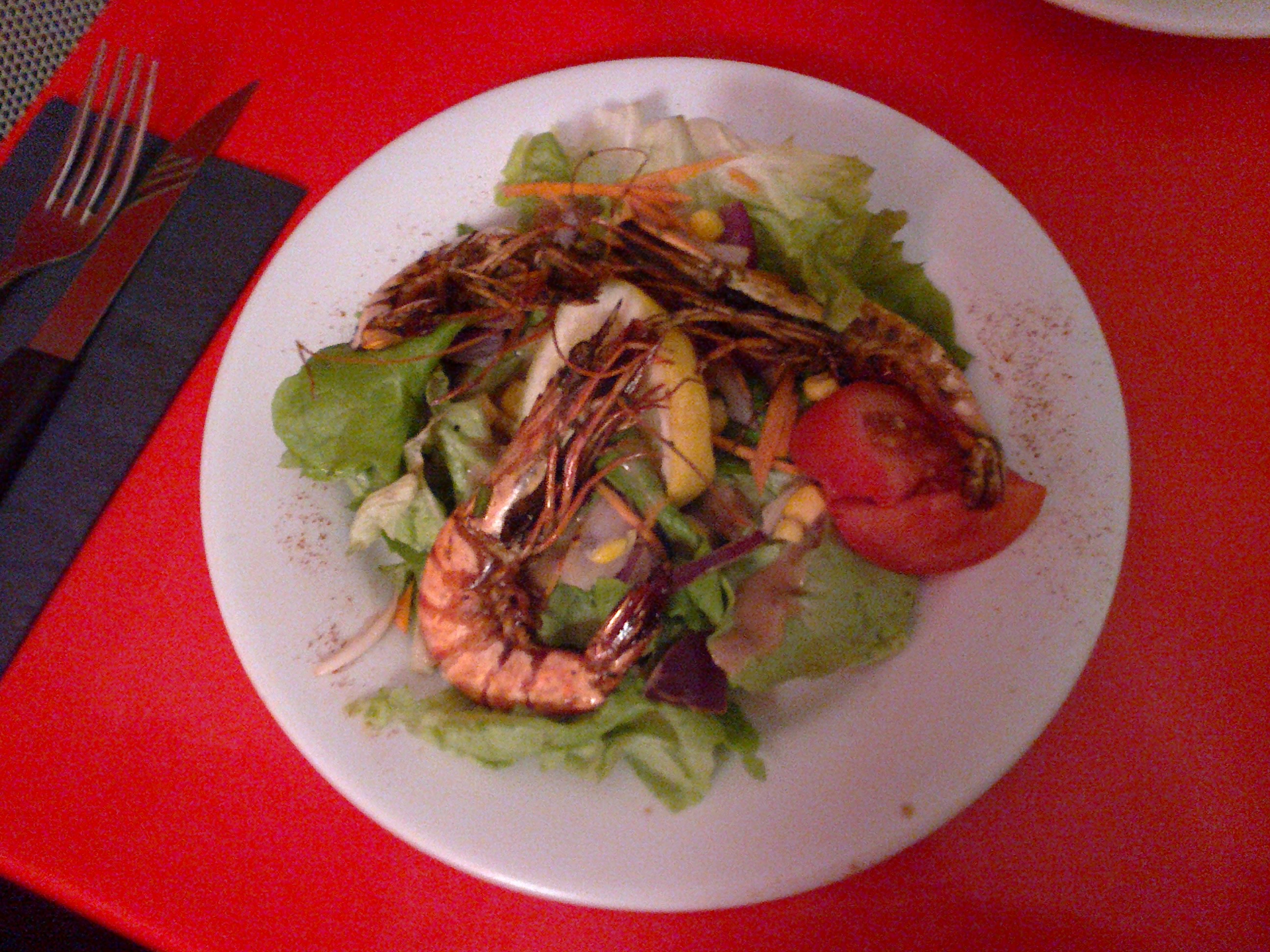 Le choix fut plutôt rapide pour nous (contrairement à d’habitude) : salade de crevettes grillée pour mon chéri et salade de cabécou rôti au miel pour moi. Nous avons été servi très rapidement. même si la salle n’était qu’à moitié pleine.