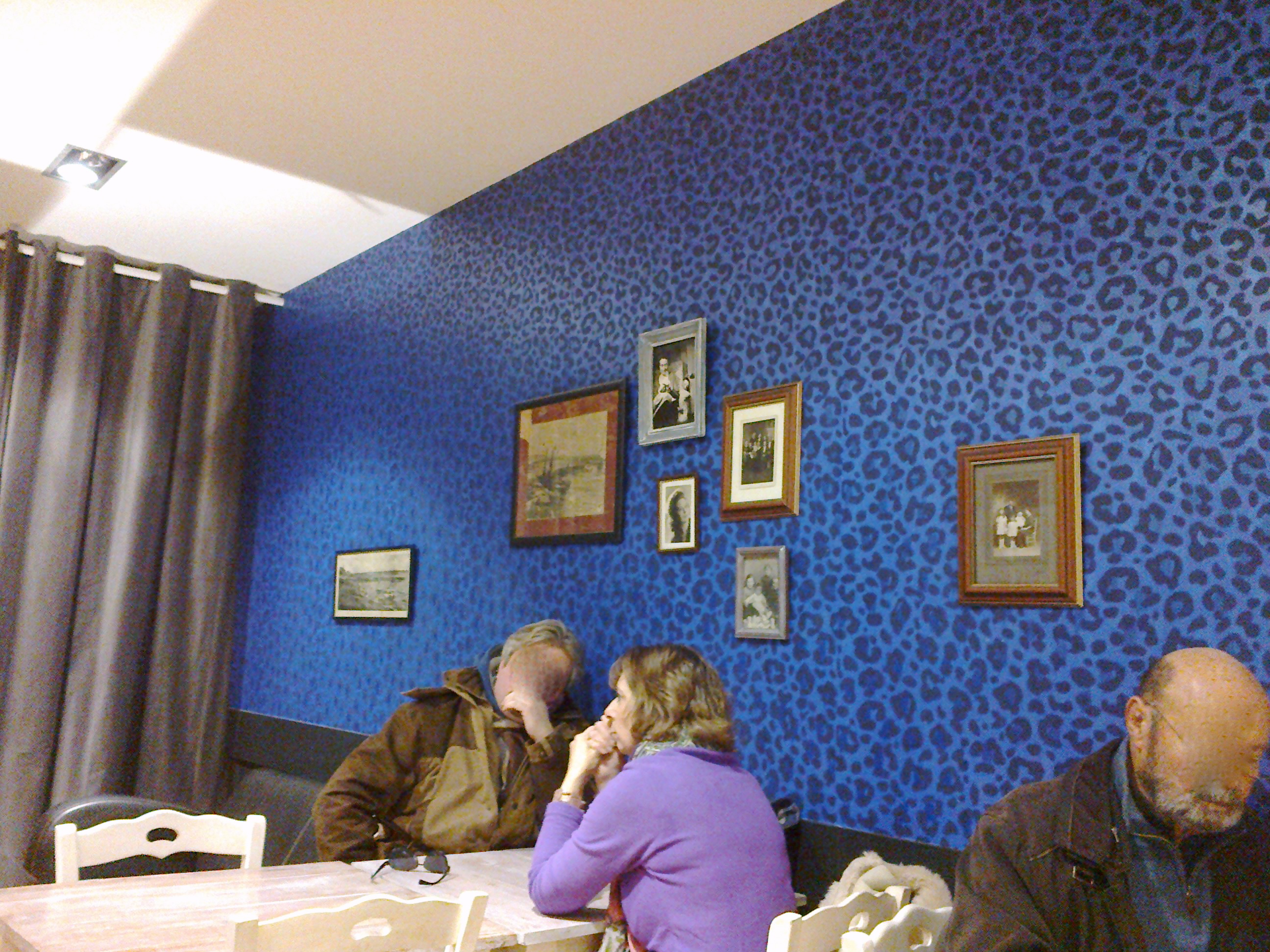 Après mon petit tour d’admiration de la boutique, j’ai rejoint ma mère dans la partie salon de thé. Cette dernière est toute petite (pour une quinzaines de personnes) et donne une impression un peu étouffante, car est elle sans fenêtre. Mais l’ambiance reste agréable et bien éclairé. J’ai bien aimé les tons bleus de la tapisserie léopard, ainsi que les cadres avec des photos de famille d’époque. Je me suis d’ailleurs demandé si c’était les photos de la famille du propriétaire du salon de thé…