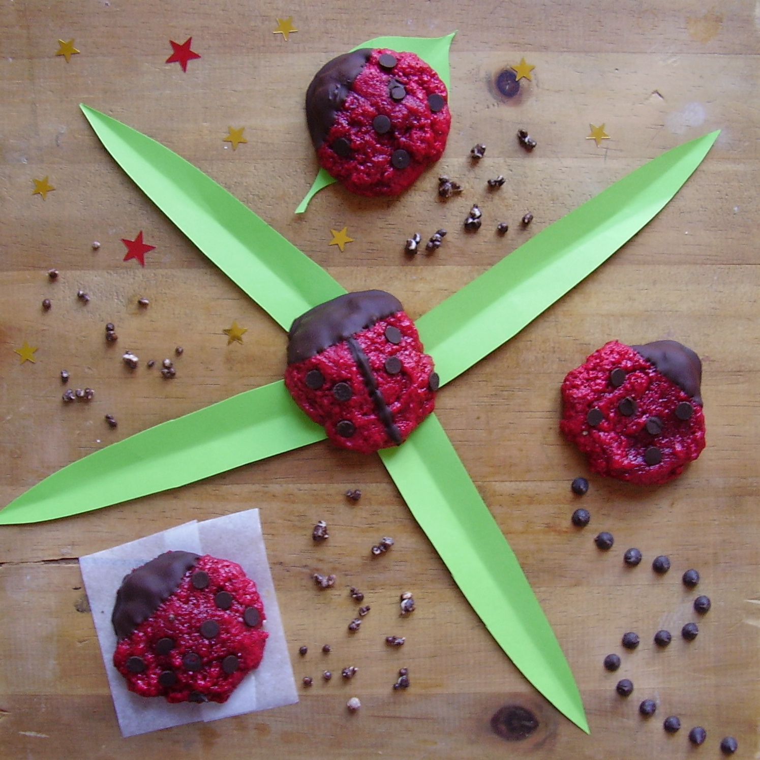 L’astuce pour que les « points » de la coccinelle soient là où l’on a envie, C’est de faire cuire les boules de cookies, de les écraser légèrement à la sortie du four pour leur donner une forme plus régulière, et d’enfoncer les pépites une à une au bon endroit.