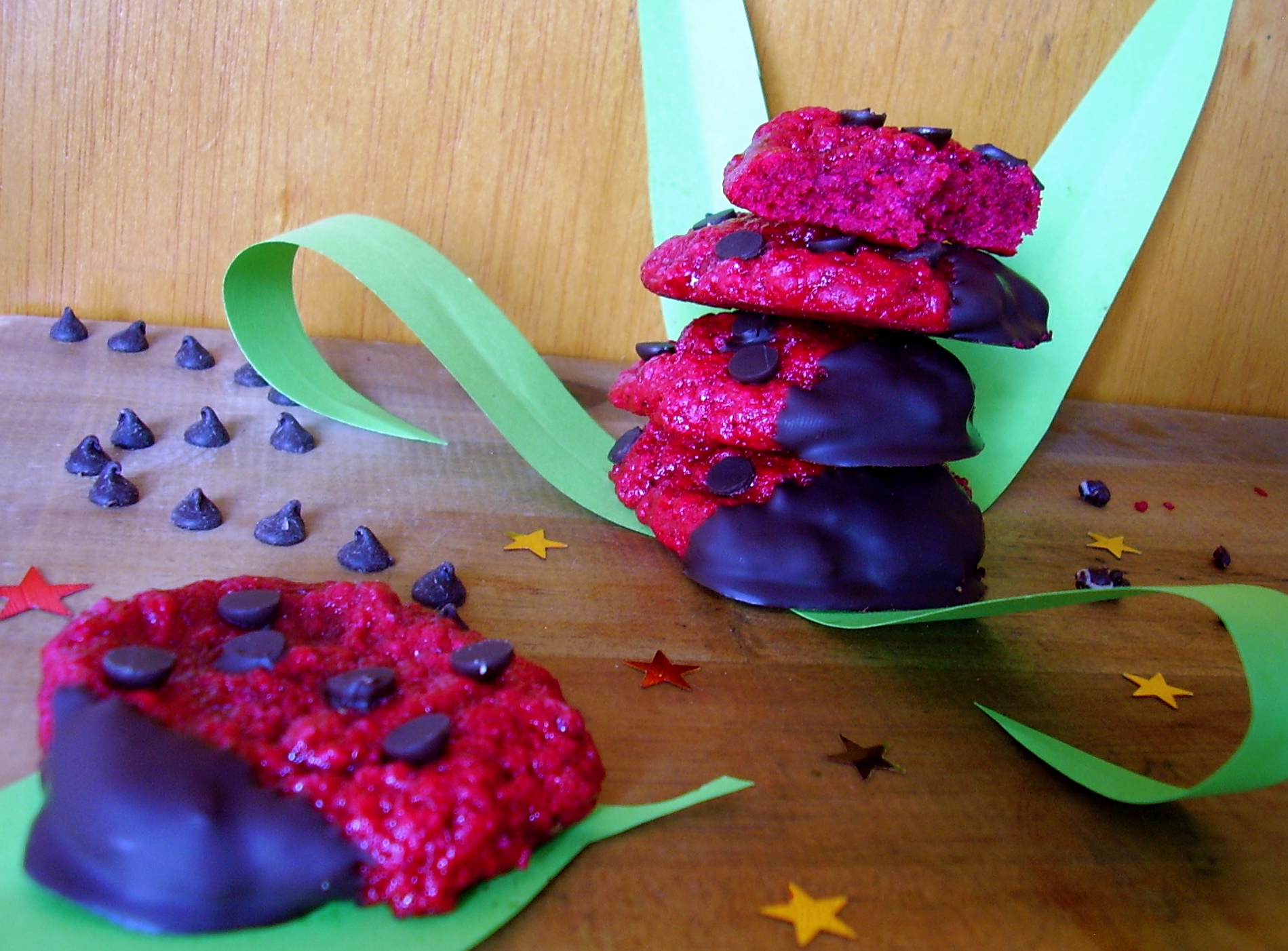 Des cookies originaux aux fruits (et au chocolat, sinon ça ne serait pas de vrais cookies qui se respectent!) en forme de coccinelle qui m’ont été inspiré par Moustache Cookies (en maintenance pour le moment) et sa nouvelle partenaire Une coccinelle en cuisine.