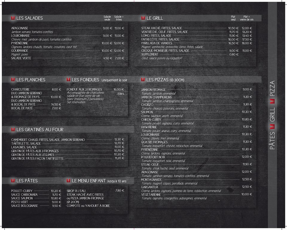 | Pizza : ±10€ Lu-Dim : 8h-22h |