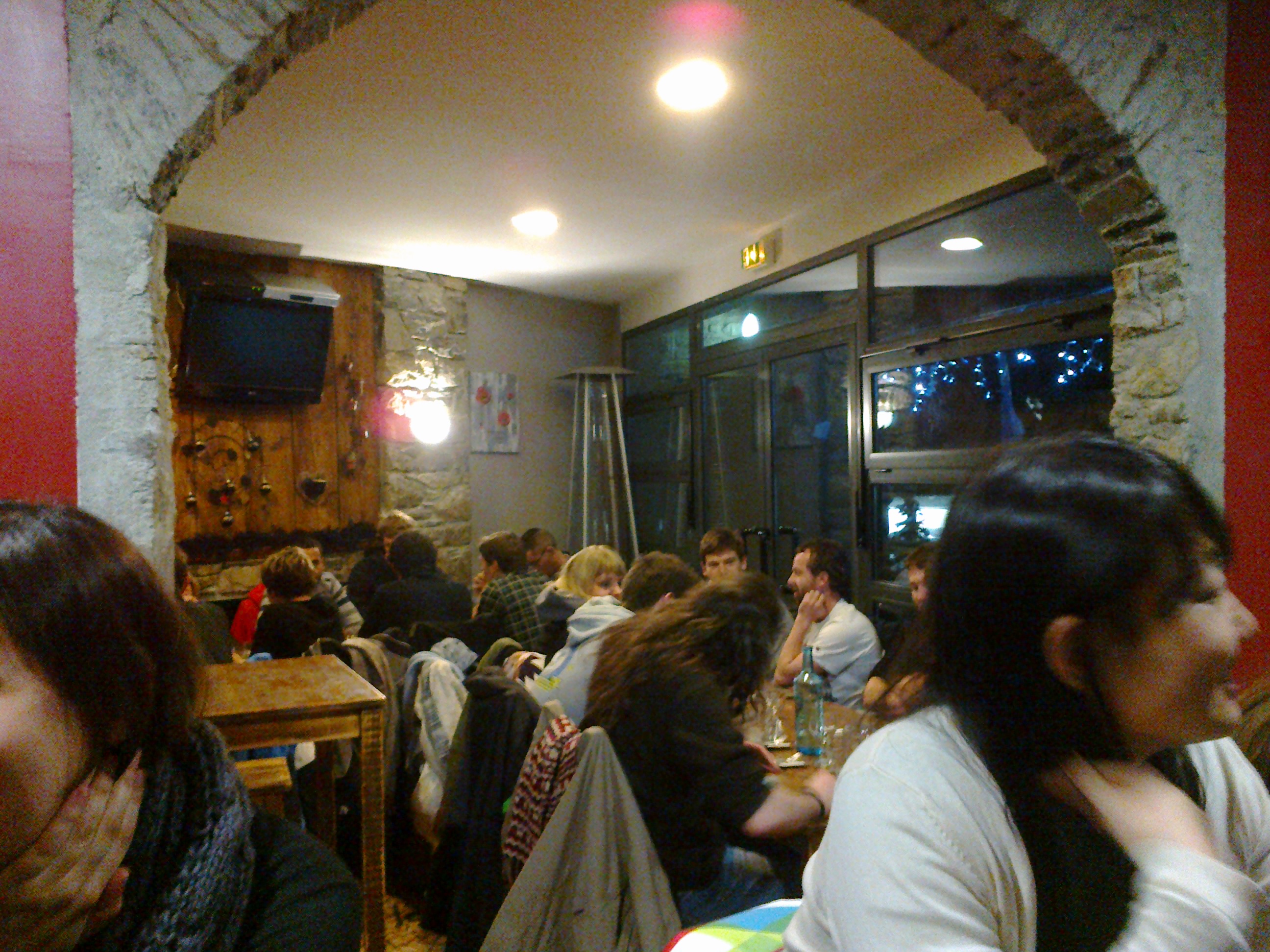 Elle était bonne, même si j’aurais peut-être aimé qu’elle soit plus crémeuse (toujours plus de reblochon et de crème!). Heureusement que la salade était là pour aider à faire glisser tout ça! Une fois de plus, ils se sont adaptés aux contraintes de chacun : pizzas pour nos amis végétariens et musulmans, salade sans sauce pour les relous. D’ailleurs en parlant de leurs pizzas, celle que j’ai vu passer avait l’air d’avoir une pâte très fine.