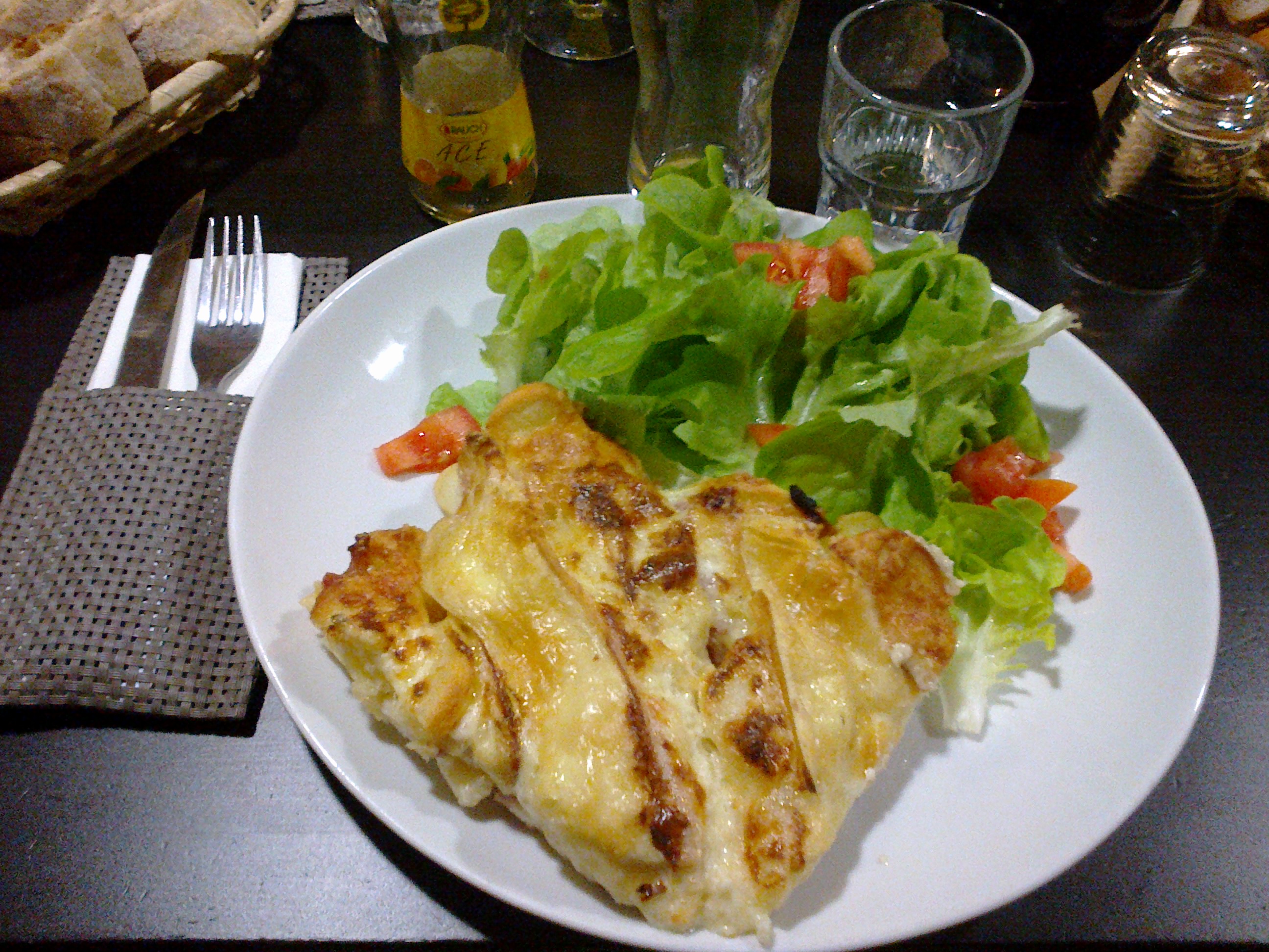 Nous avons tous été servi en moins de 10 min alors que nous étions une petite trentaine et la tartiflette était brûlante! Et puis quelle part de tartiflette! En temps normal leur portion m’aurait fait au moins 3 repas! Elle était vraiment ENORME! Sans oignon, ni vin blanc (je ne suis pas une spécialiste de la tartiflette, mais il me semble qu’il y a un débat sur le présence du vin blanc…).