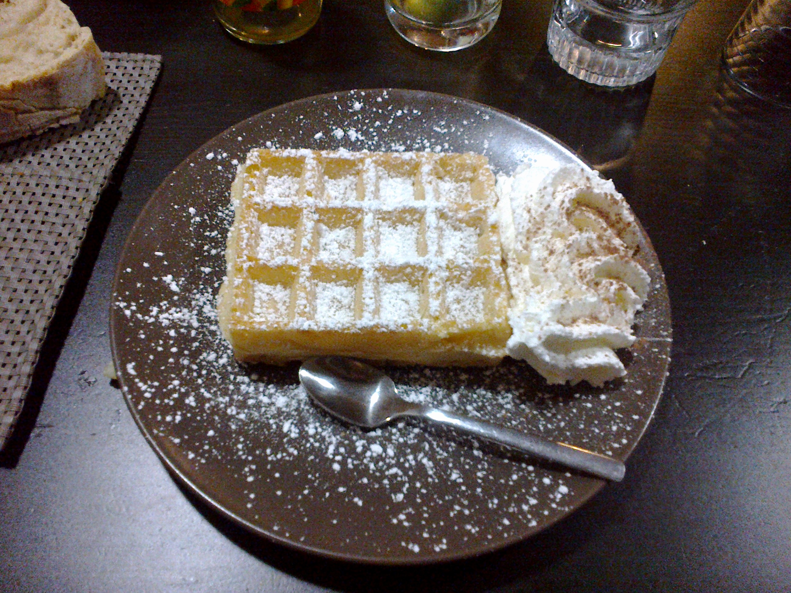 Ca a commencé à se gâter au niveau du dessert. Après un plat aussi copieux et bourratif (la plupart d’entre nous étions déjà à l’agonie), on s’est retrouvé avec une gaufre au sucre accompagnée de chantilly! Je crois qu’on aurait tous préféré une salade de fruits ou une boule de glace plutôt que ça. Apparemment l’année dernière, ils avaient eu une crêpe au chocolat en dessert. Pour le coup, même ça se serait mieux passé. La gaufre était bonne, la pâte en elle même très peu sucrée (j’ai apprécié), mais après tout le reste, c’était trop sec (selon moi). J’ai été incapable de la finir alors que j’aime ça ! Pour finir, nous avons eu le droit au café. Je crois que la tisane verveine-menthe m’a sauvée!