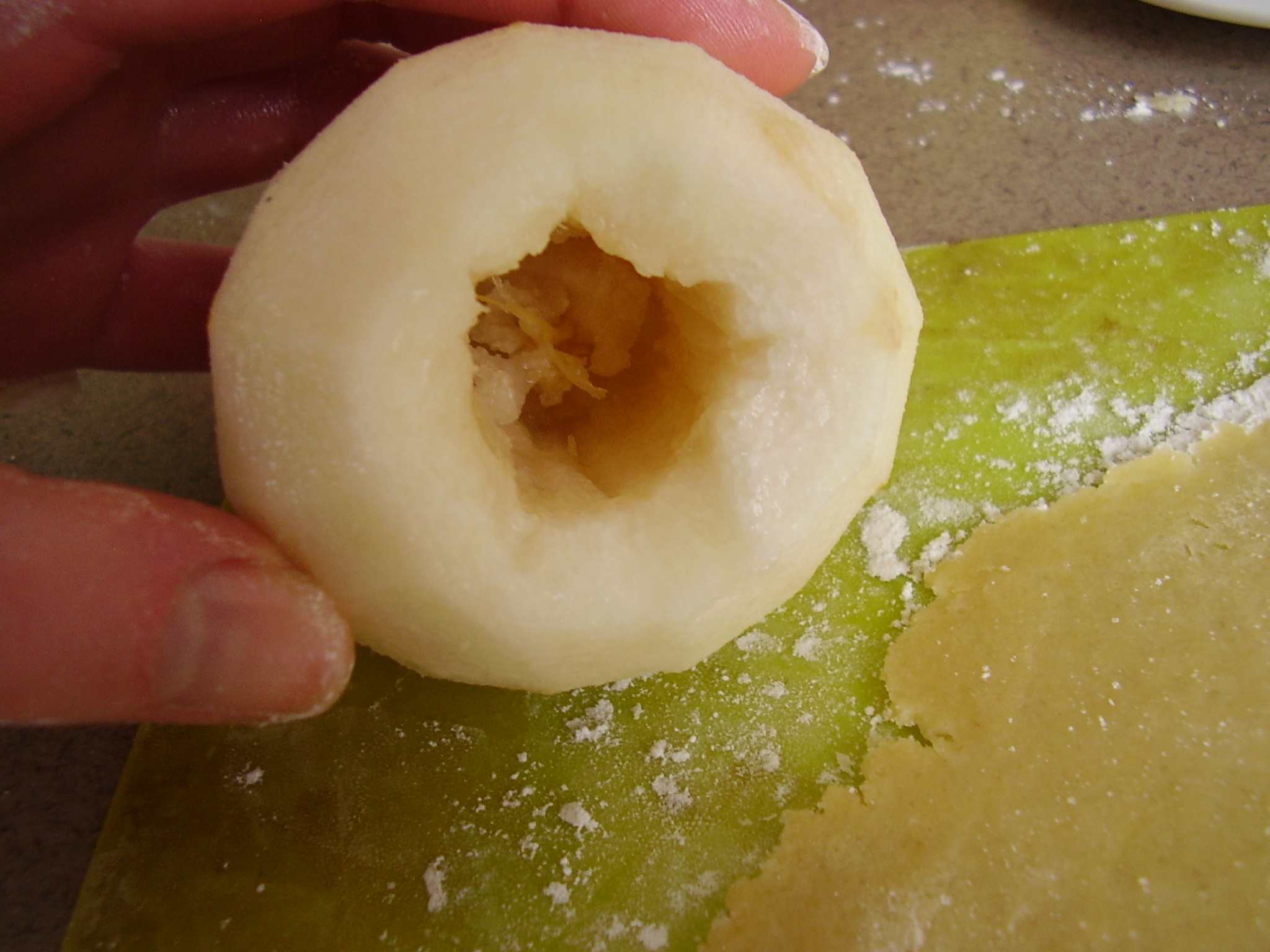 - Déposez une poire au centre de chaque cercle de pâte. Saupoudrez éventuellement de cannelle ou de sucre vanillé ou d’alcool de poire (voire du calvados)…