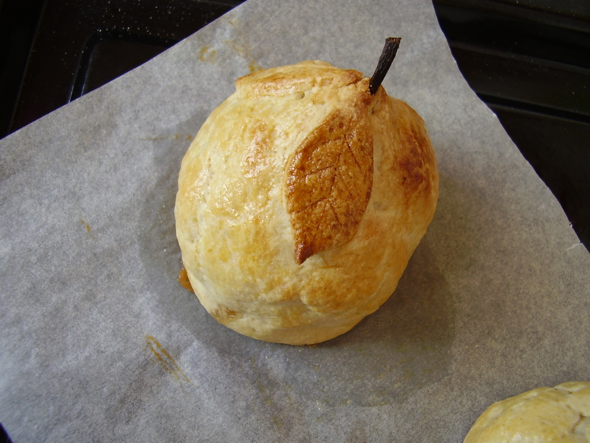 - Déposez les douillons sur une feuille de papier sulfurisé, dorez les avec du jaune d’oeuf avant d’enfourner pour 20-30 min. La croûte doit dorer. Si jamais la croûte dore trop avant la fin du temps de cuisson, enrobez les couillons de papier aluminium pour que les poires aient de le temps de devenir un peu plus fondante. Si vous utilisez des poires au sirop, vous pouvez réduire le temps de cuisson.