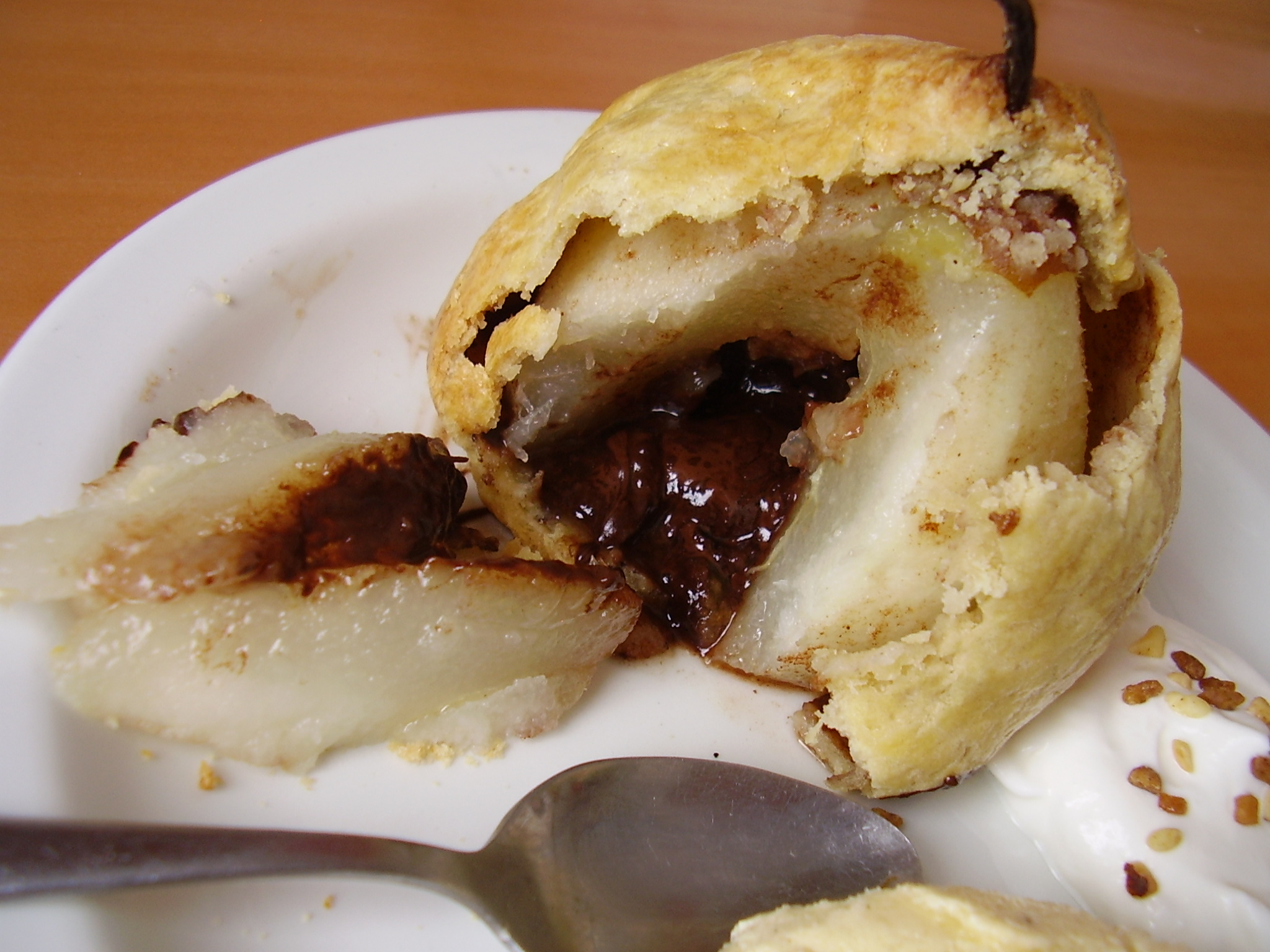 Pour encore plus de gourmandise, je pense qu’il serait possible de tremper intégralement la poire dans du chocolat pour la piéger dans une coque avant de l’enrober de pâte. Fontaine de chocolat garantie à la dégustation!