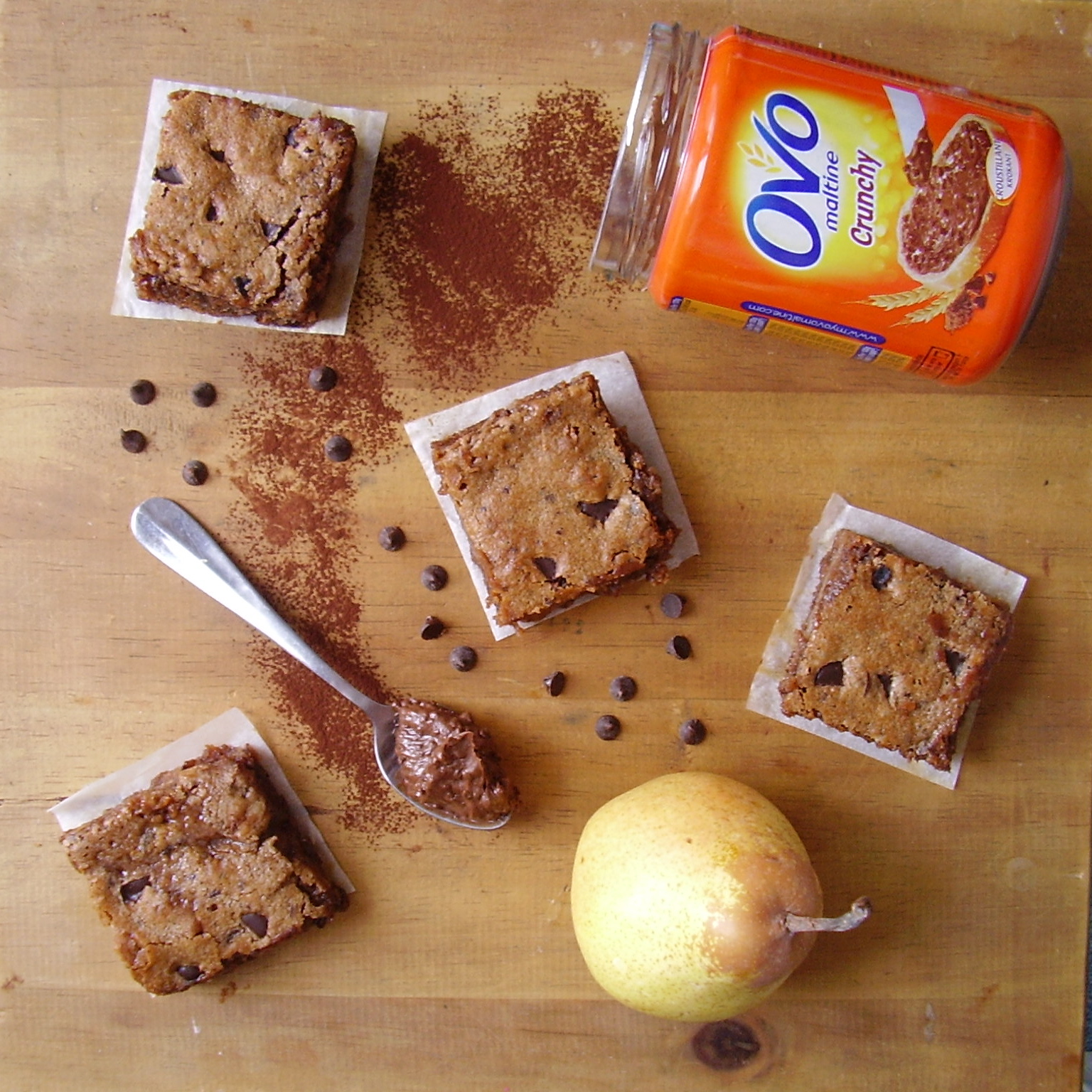 Voici donc un brownie assez gourmand et régressif, à la texture à la fois crunchy, grâce aux brisures d’Ovomaltine dans la pâte à tartiner mais aussi fondante, grâce aux morceaux de poires ! Un dessert qui se prépare en un clin d’oeil juste à l’aide d’une cuillère en bois ou d’un batteur !