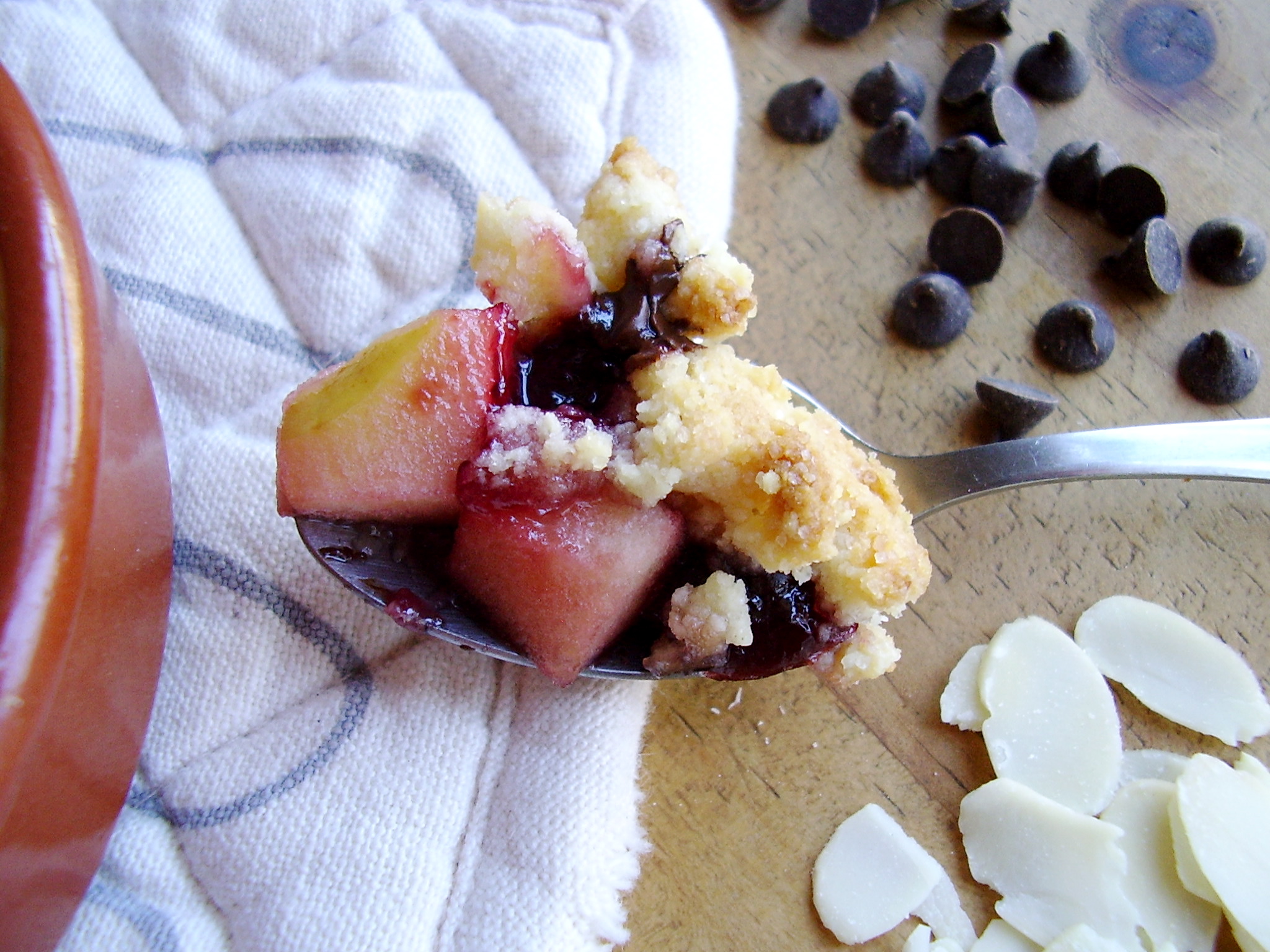 Du coup, je vous propose une recette simple mettant en jeu des cerises avec de la pomme, du chocolat pour faire bonne mesure et un crumble parfumé à l’amande parce que c’est vraiment une alliance divine avec la cerise!