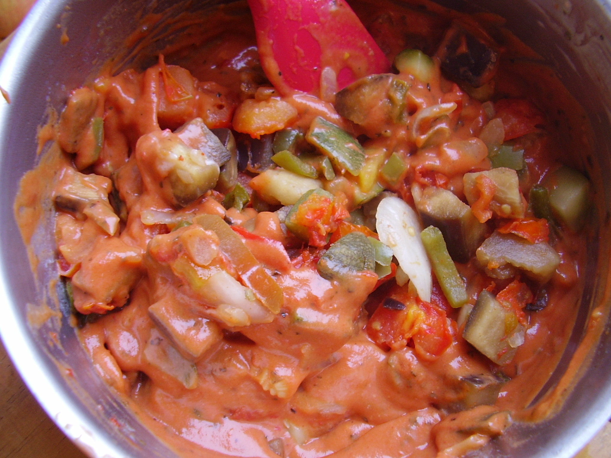 8. Retirez du feu et ajoutez les légumes à ratatouille égouttés à cette sauce.