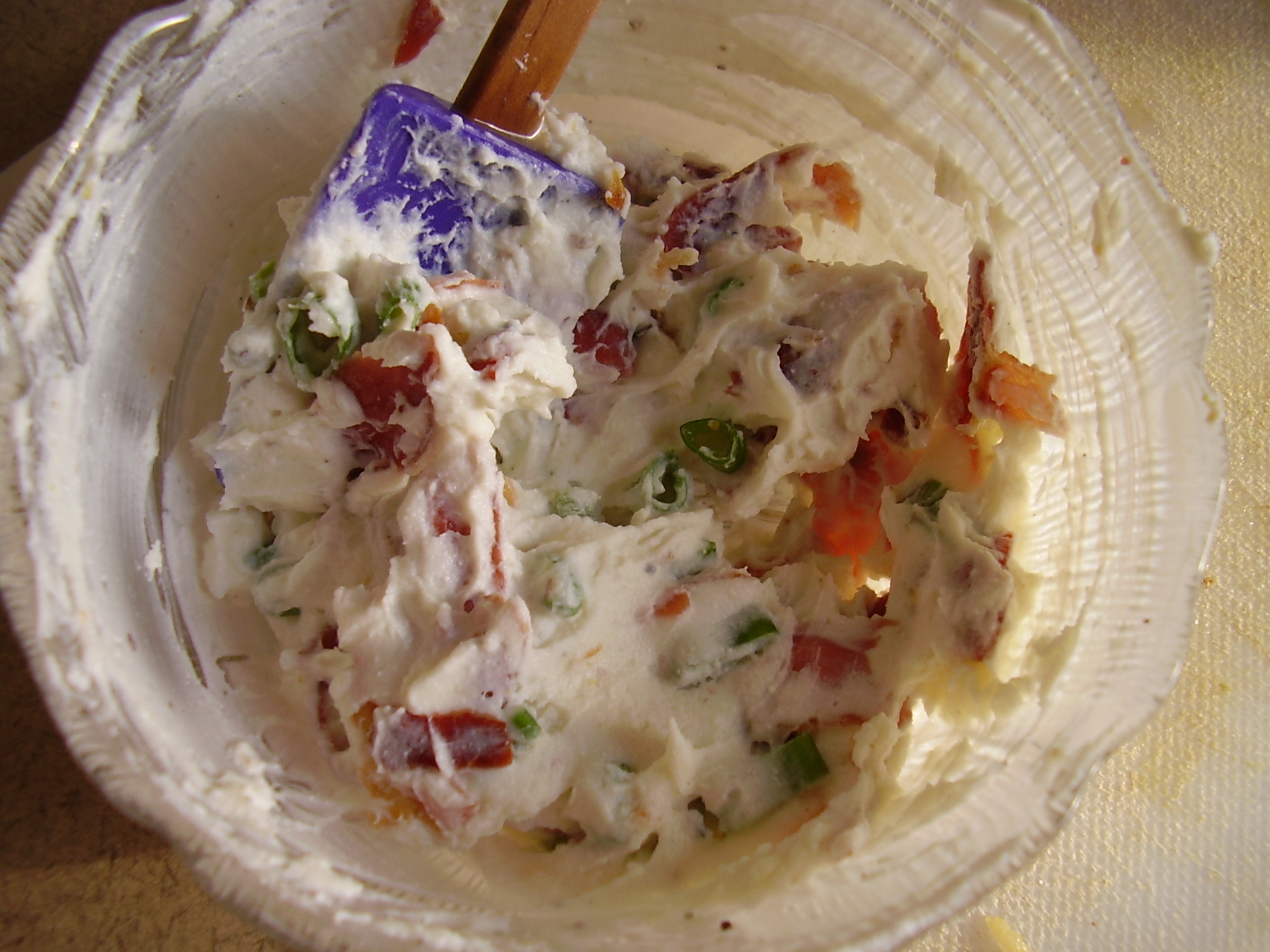 - Mélangez le chèvre frais à la crème et au poivre à l’aide d’une fourchette jusqu’à avoir une belle pâte onctueuse. Ajoutez les les rondelles de tige de ciboule et les morceaux de jambon. Mélangez bien.