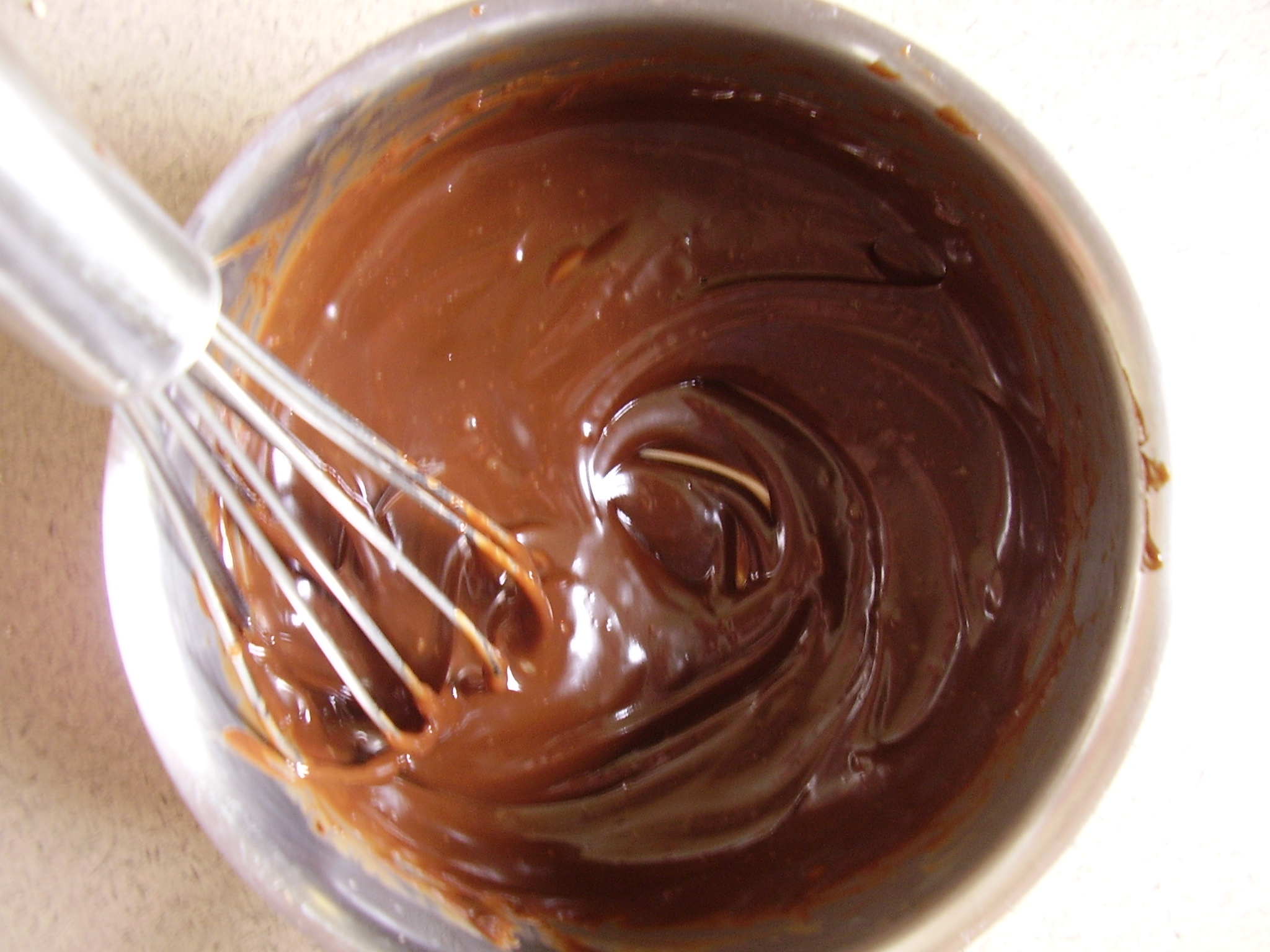 - Pour la ganache : Faites fondre le chocolat avec la moitié du lait dans une casserole. Quand il est bien fondu ajoutez le nutella et l’arôme de vanille et remuez jusqu’à avoir un mélange lisse.