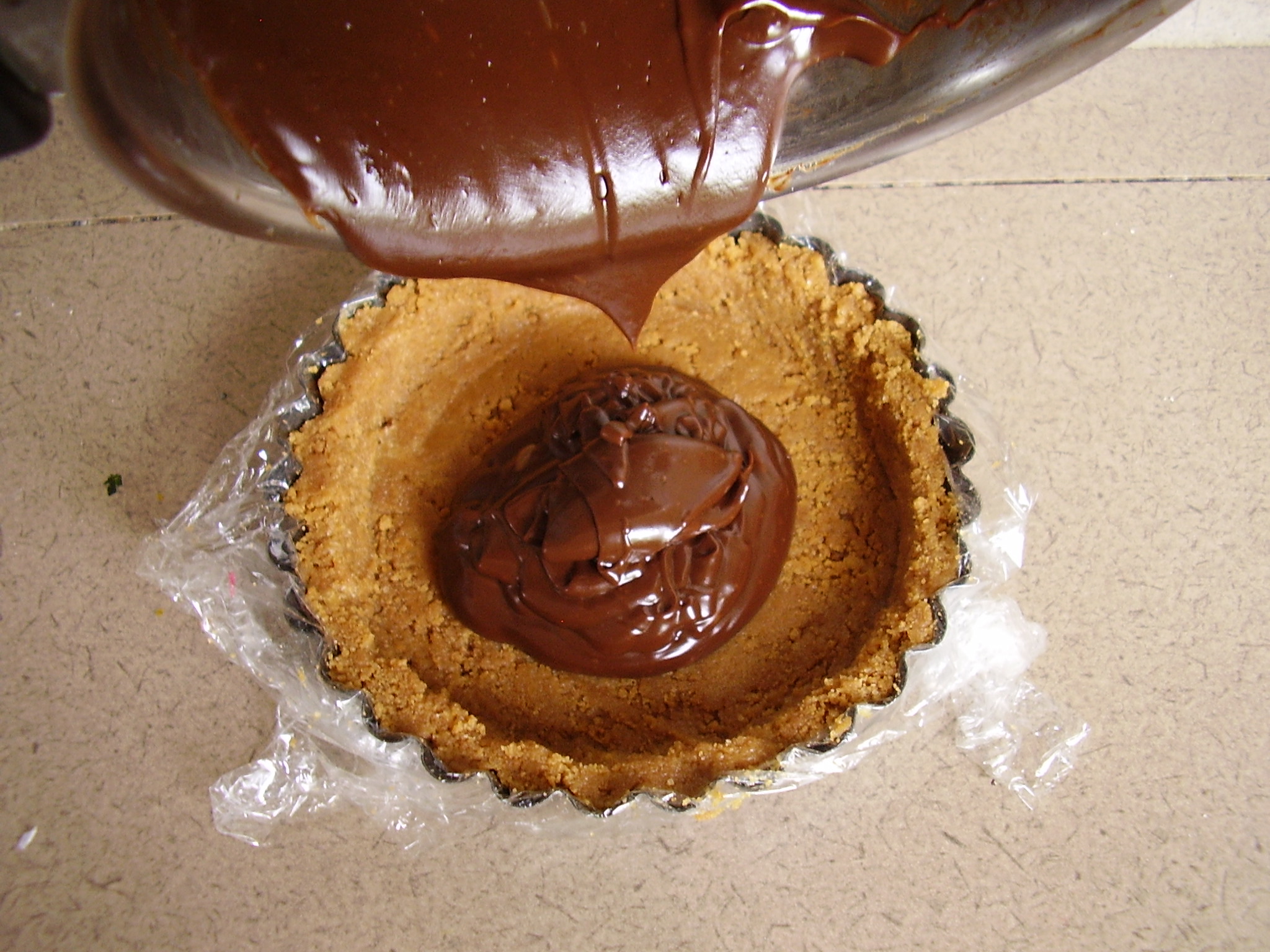 - Tapissez en 2 moules à tartelettes (chemisés avec du cellophane) et placez les au réfrigérateur.