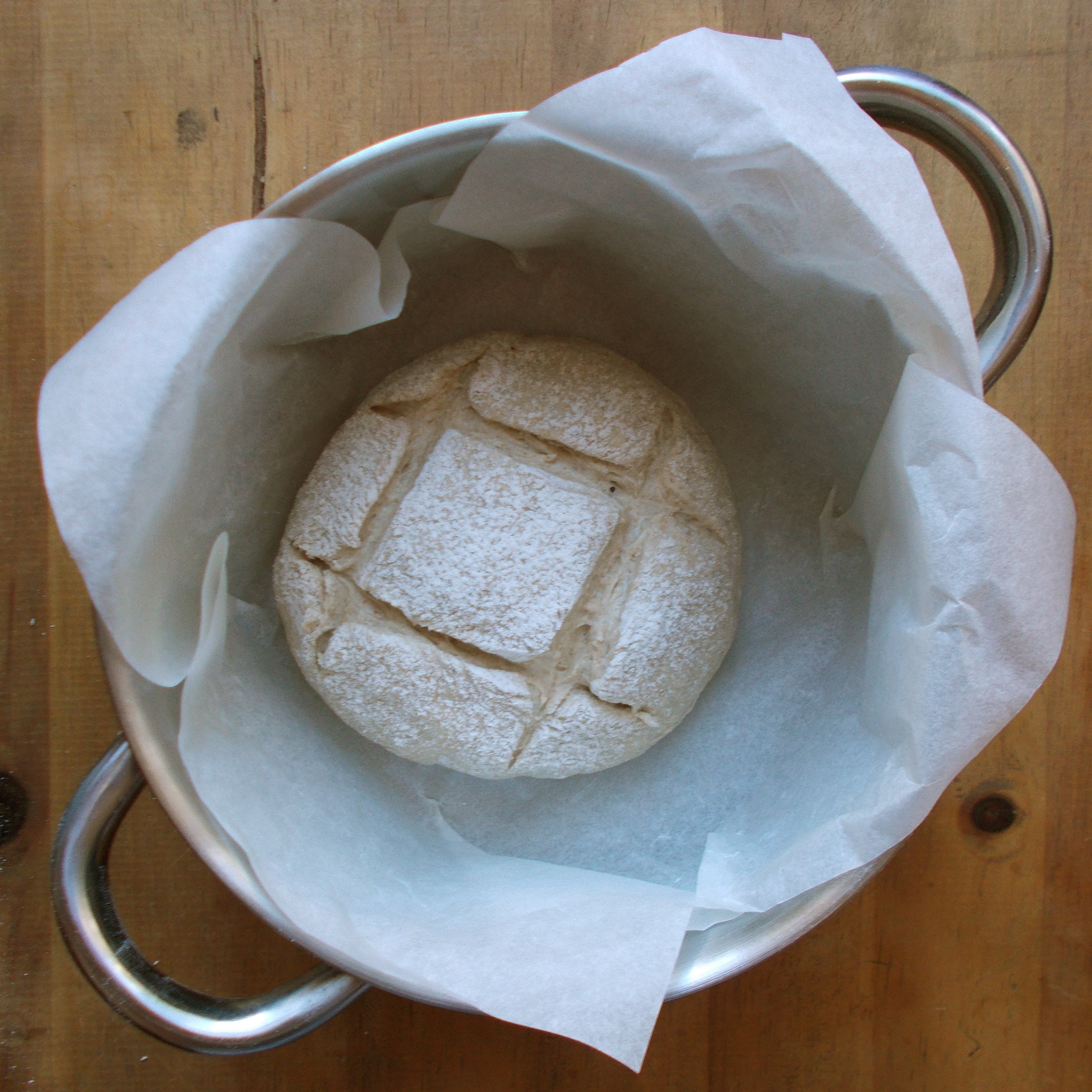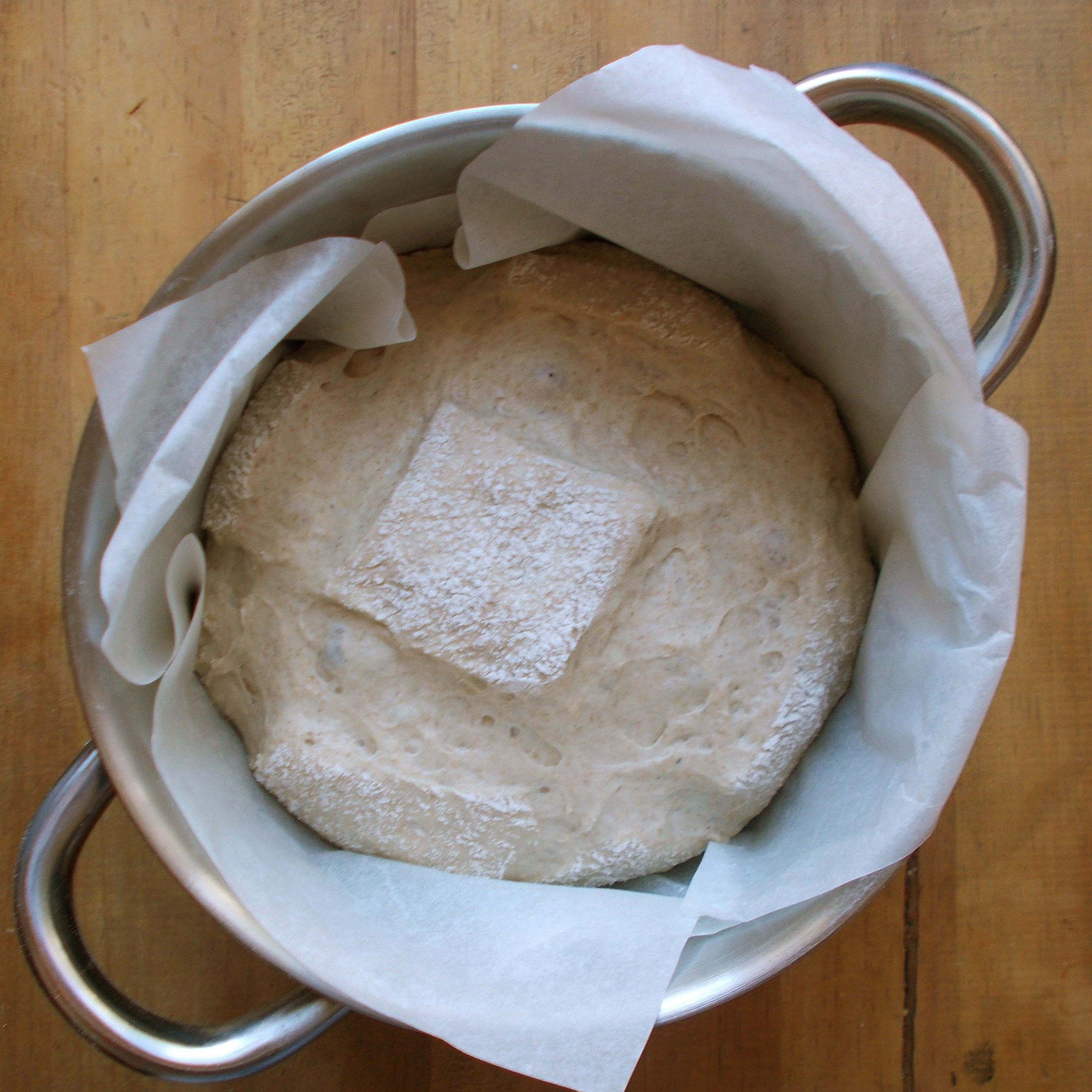 - Fermez la cocotte avec un couvercle. Laissez lever 1h à température ambiante. Le pain doit doubler de volume.