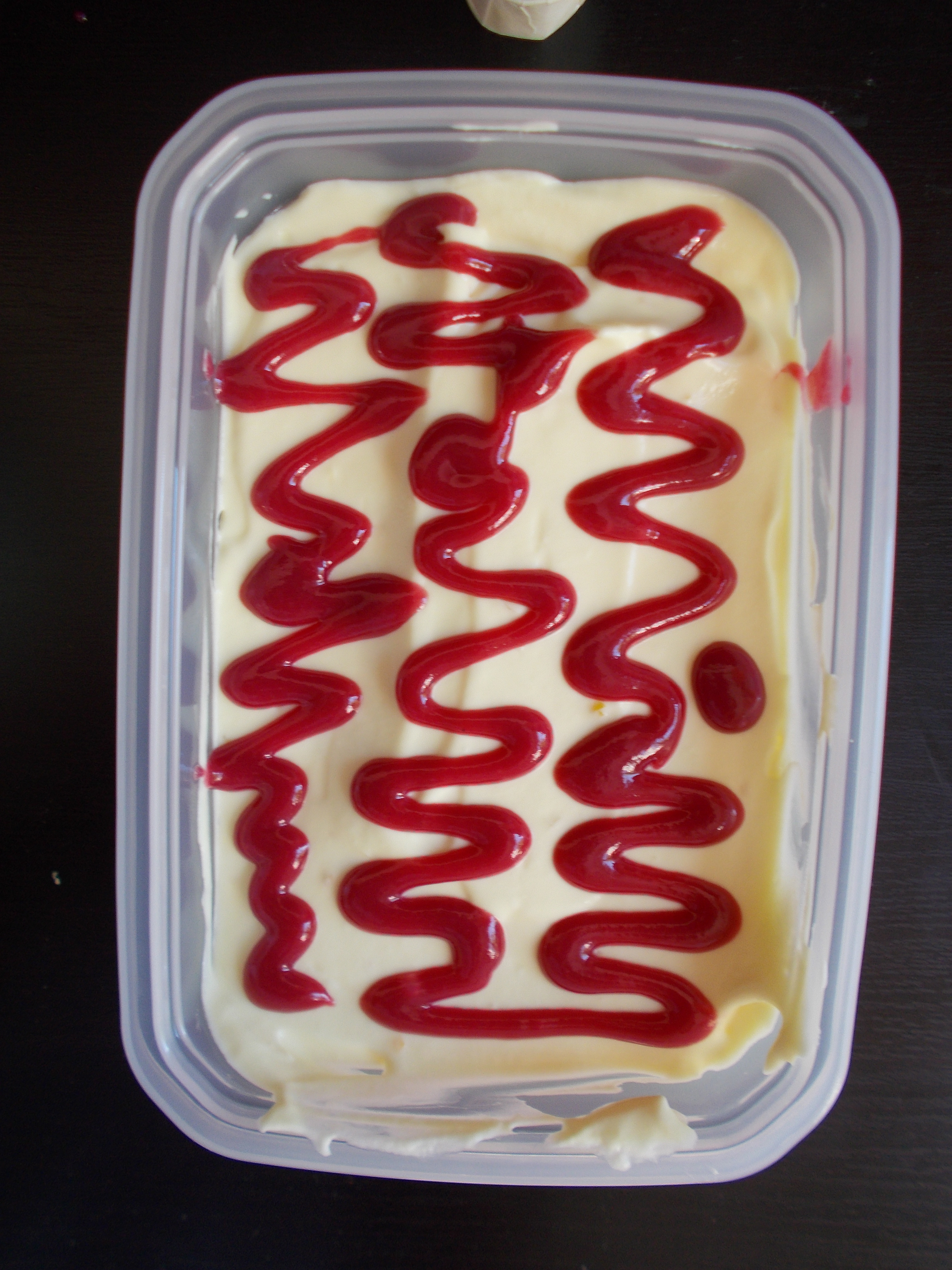 - Réalisation des marbrures : versez la moitié la préparation dans un bac type tupperware (0,75cl convient très bien).
