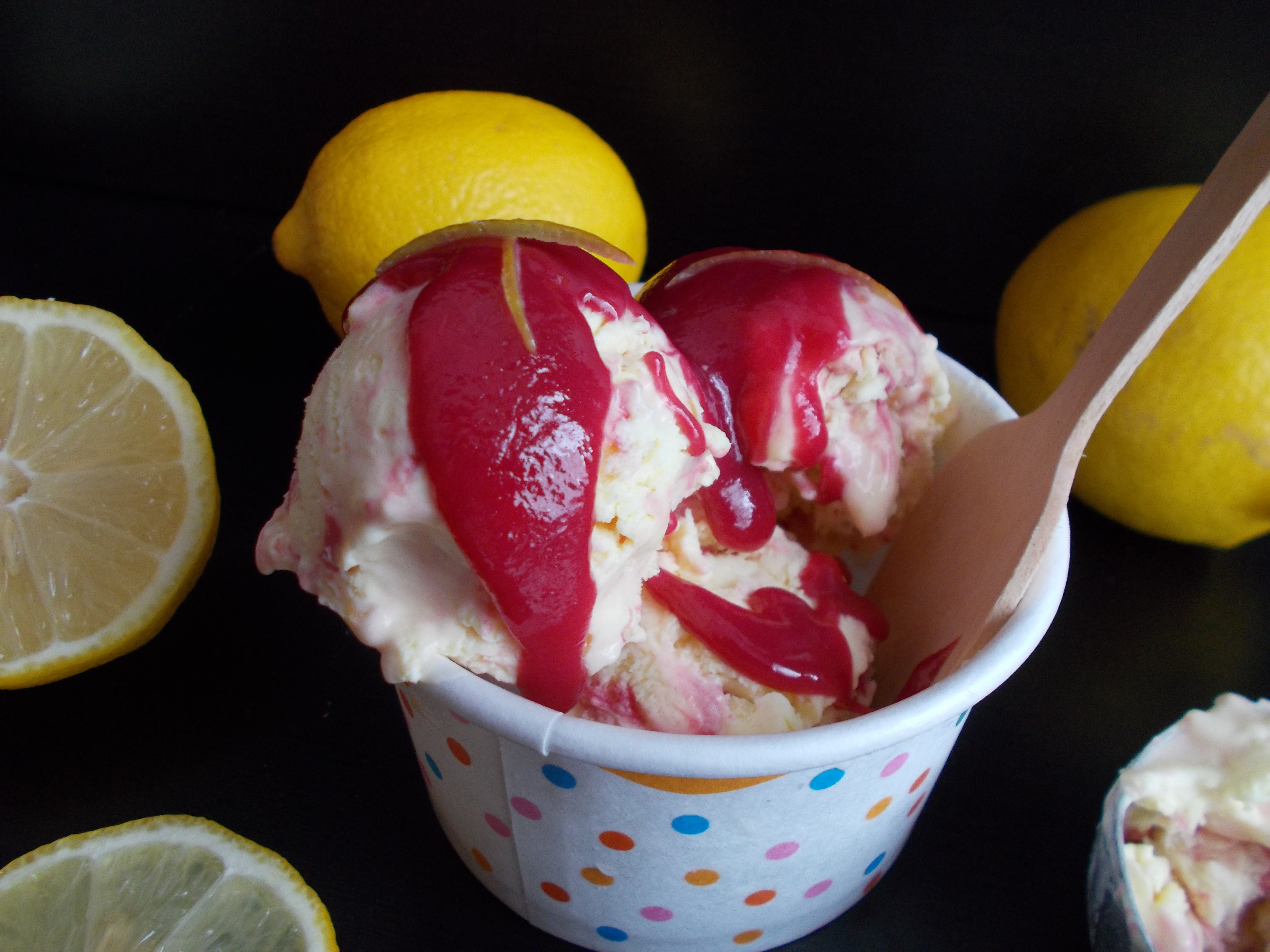 Qu’il y a-t-il de meilleur que le mariage citron-framboise ? J’en avais déjà fait l’expérience avec des muffins. Je vous propose donc une glace au citron avec des marbrures à la sauce chocolat blanc-framboise…
