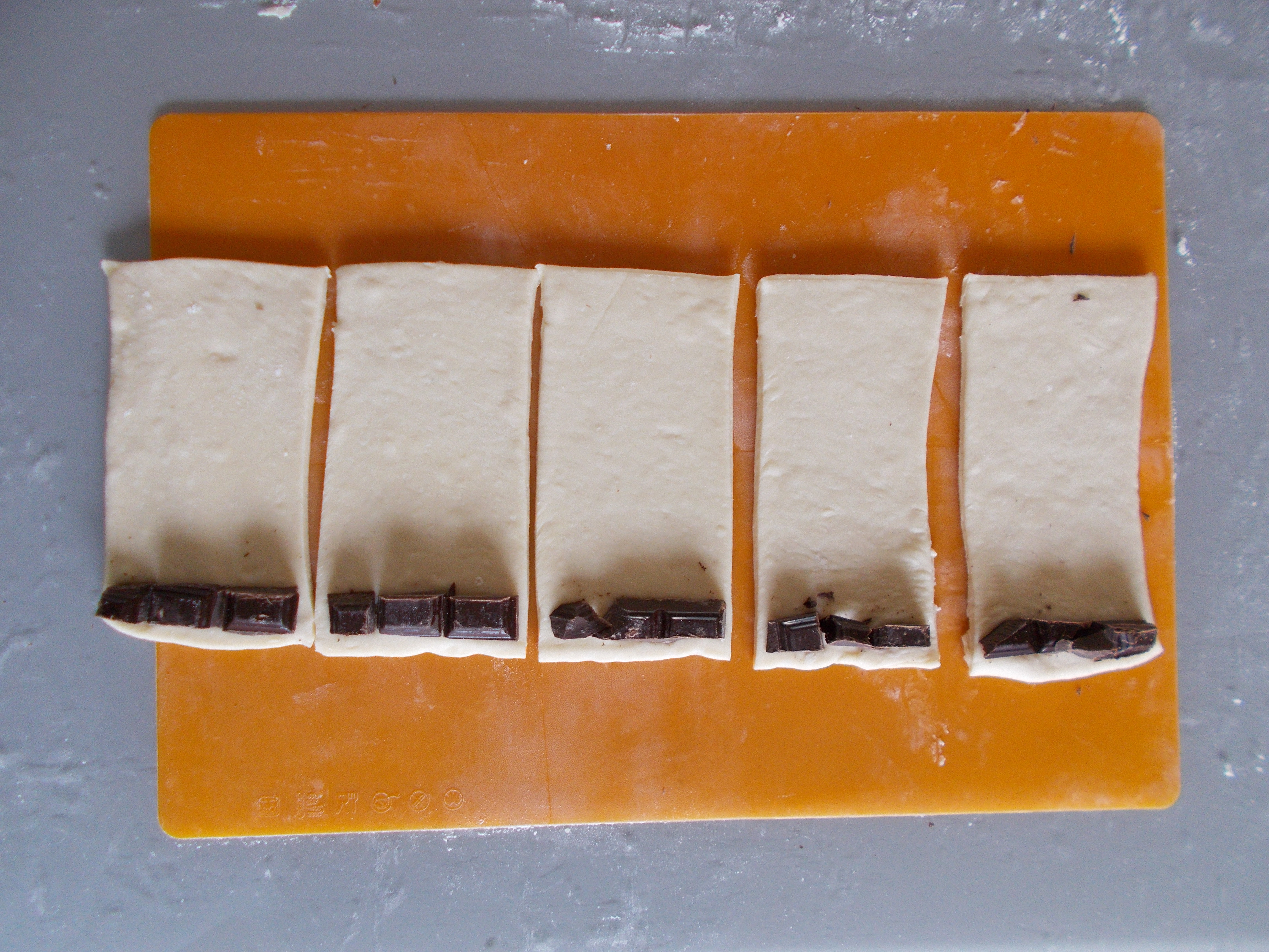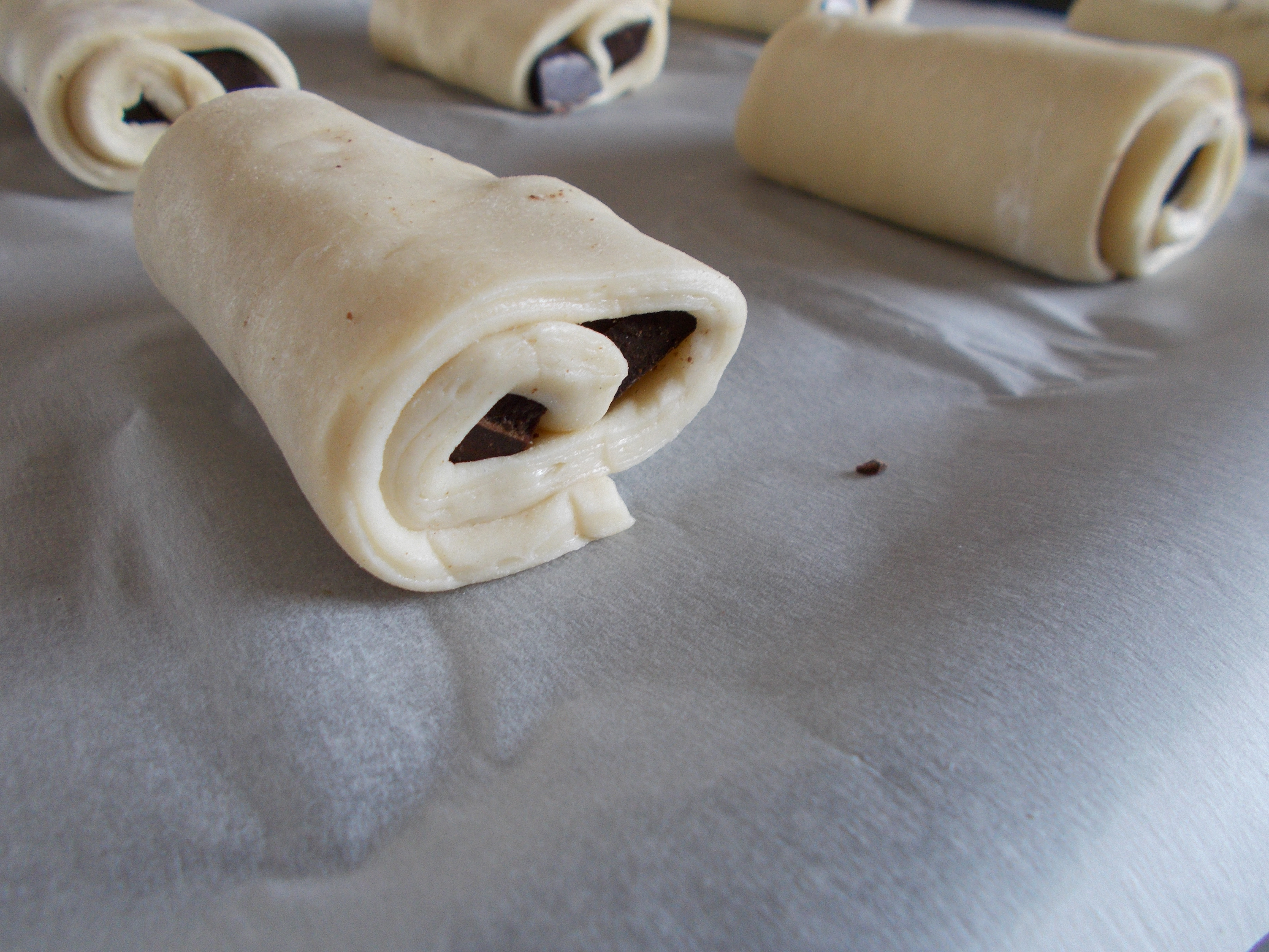 - Déposez les pains au chocolat ainsi formés sur une feuille de papier sulfurisé en plaçant si possible la jointure sous le pain au chocolat.