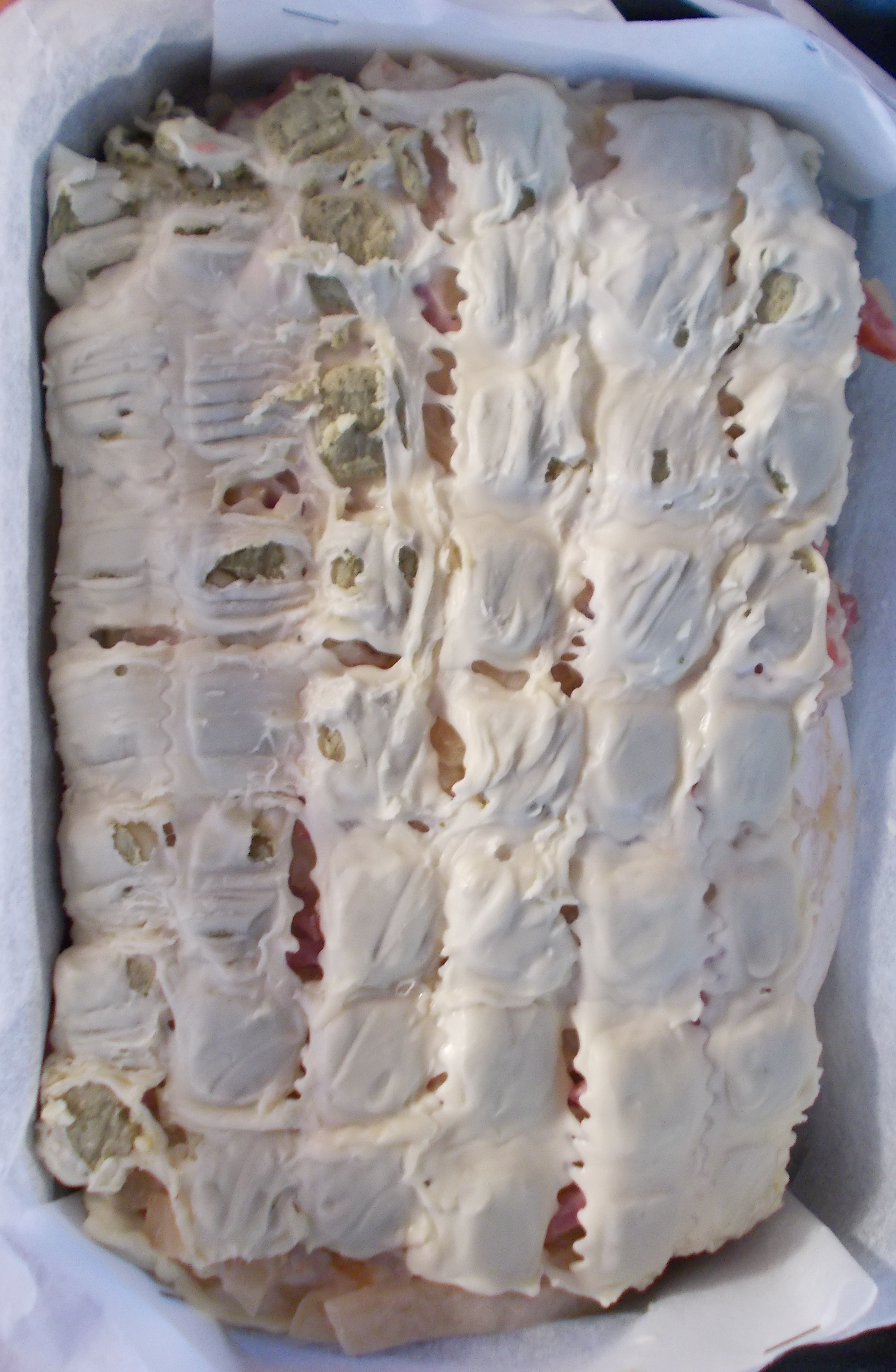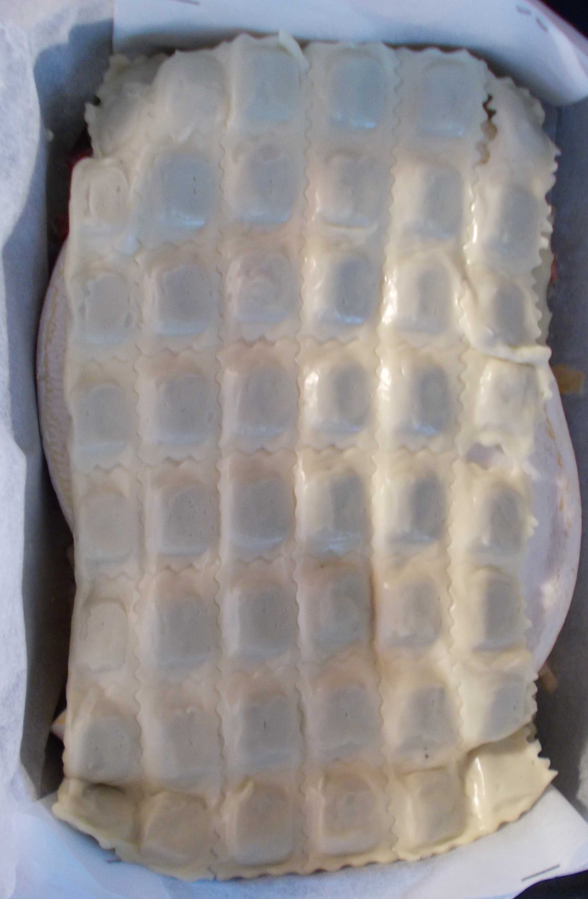 - Dressage : placez une plaque de raviolis dans le fond de votre plat à gratin (attention, ça colle un peu et pas besoin de pré-cuisson à l’eau).