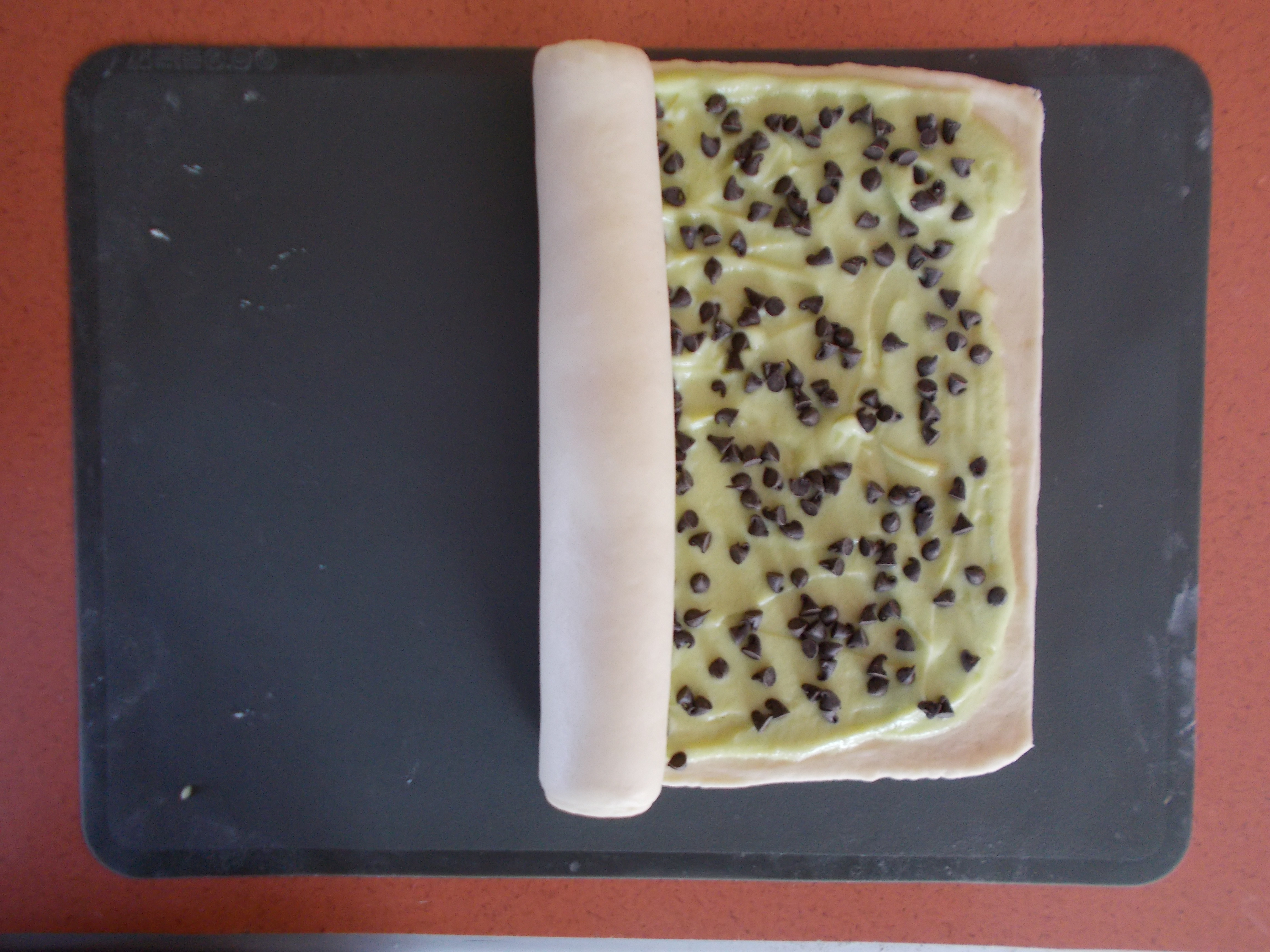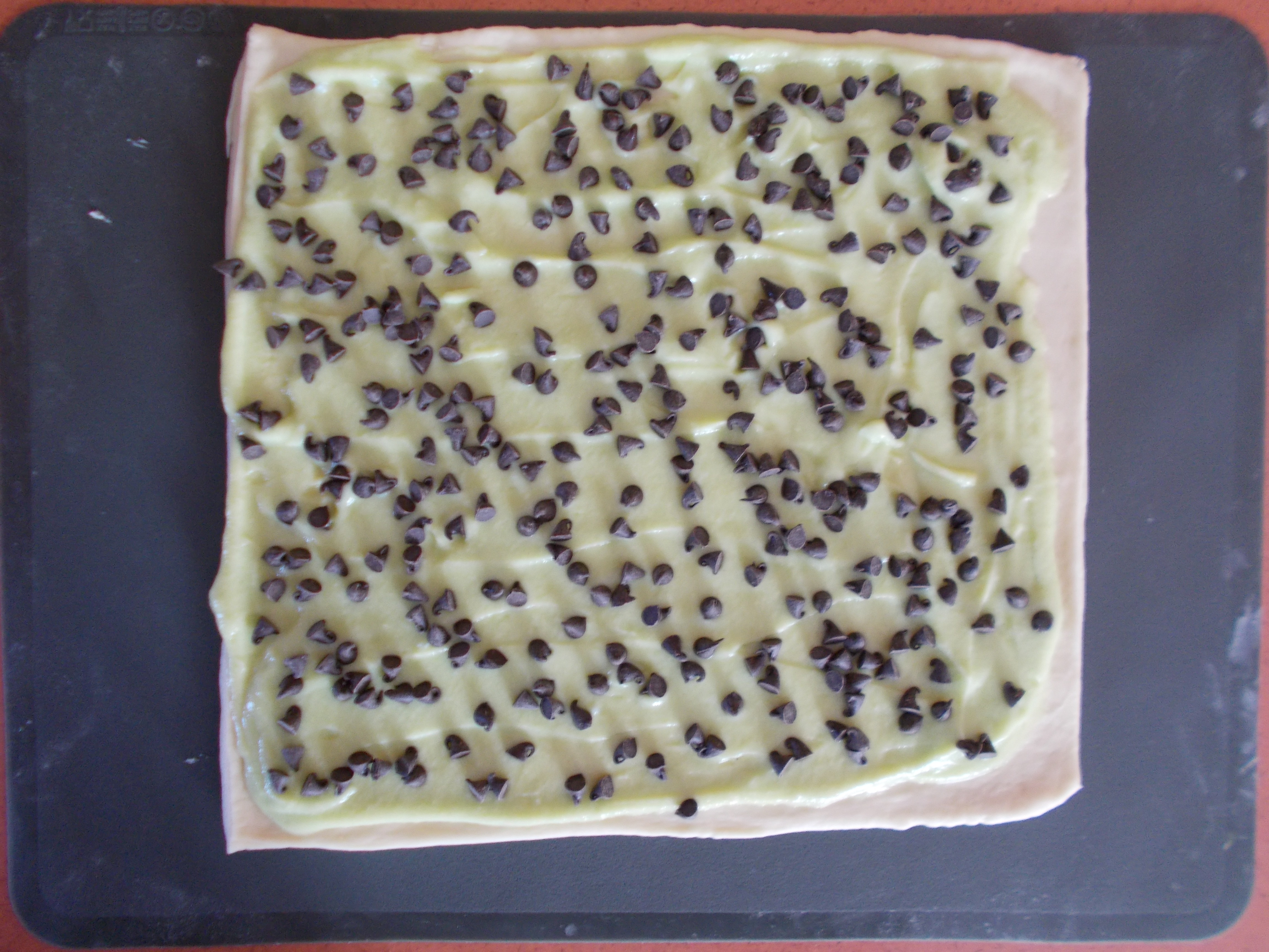 - Recouvrez le rectangle de crème pâtissière puis répartissez les pépites de chocolat dessus.