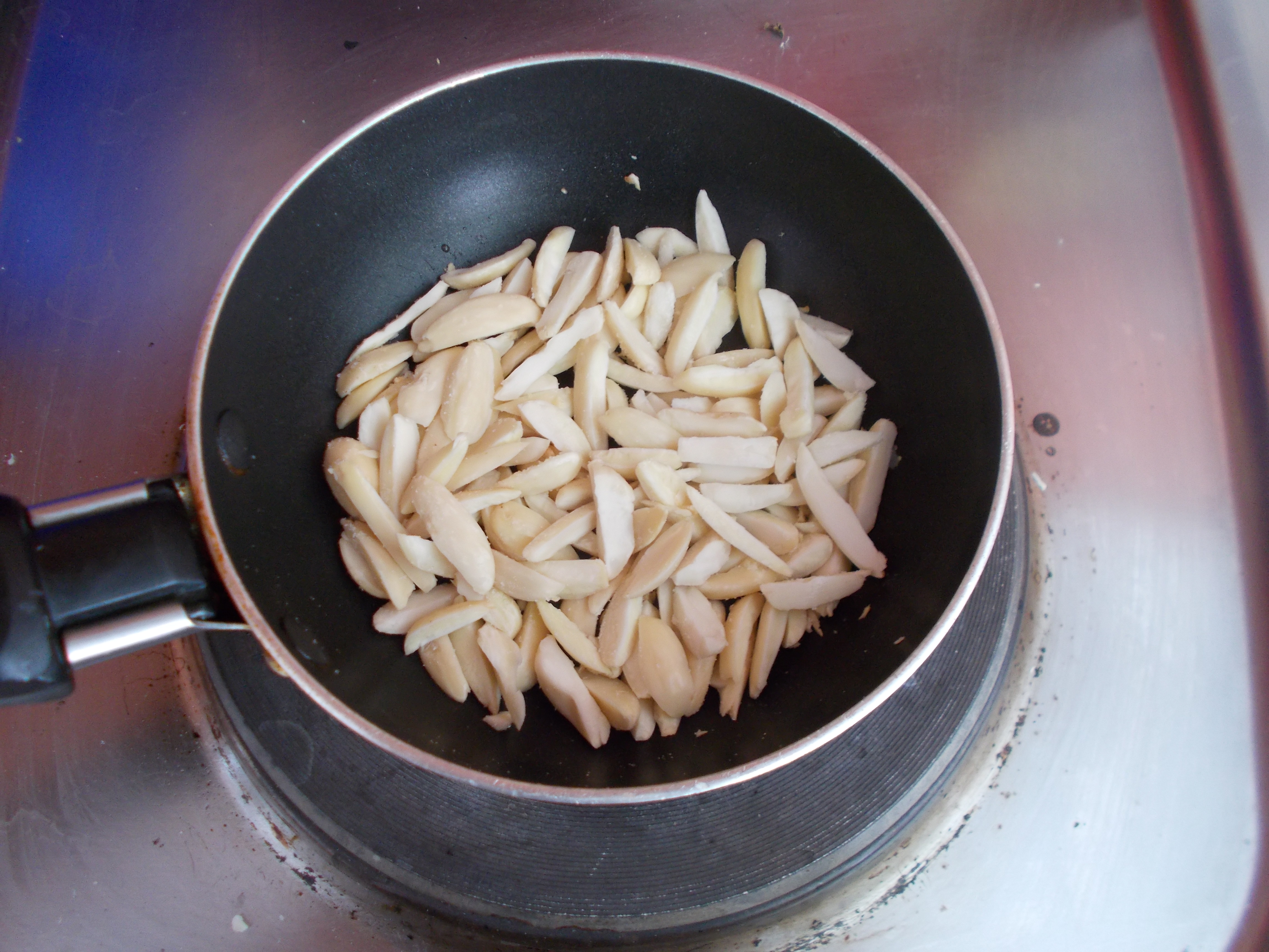- Préparez les amandes : faites chauffer une poêle à sec avec les amandes.
