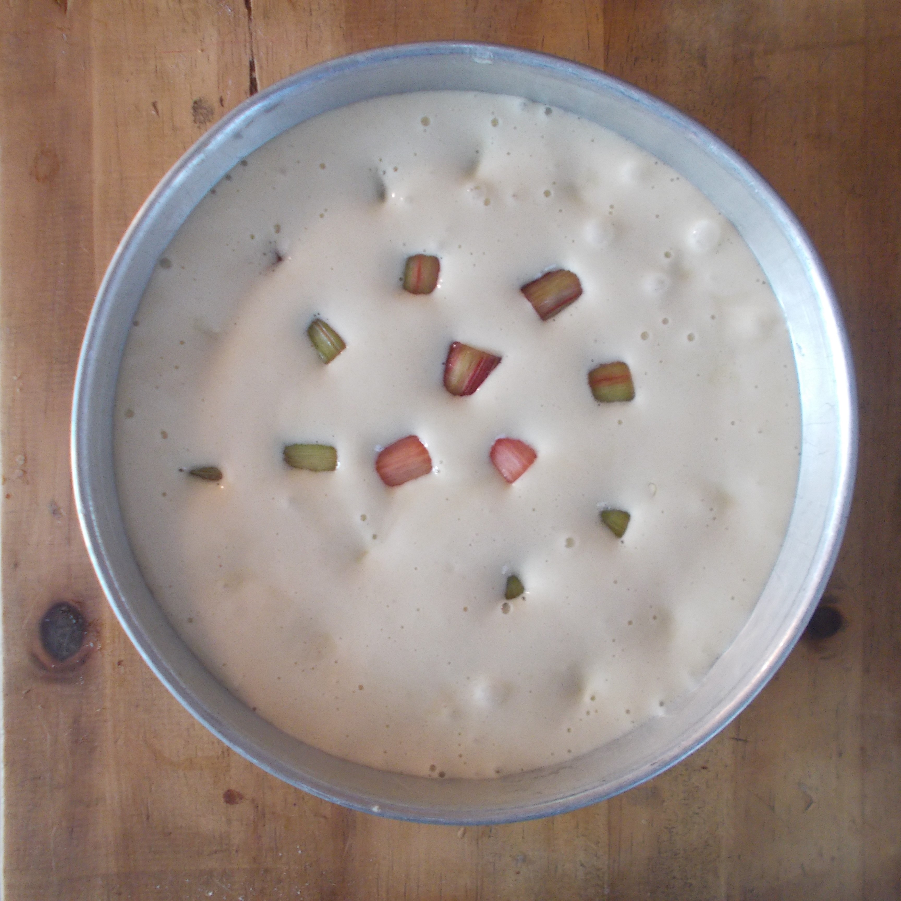 - Farinez les morceaux de rhubarbe et déposez les à la surface de la pâte (ils vont couler petit à petit). Parsemez avec des amandes effilées.