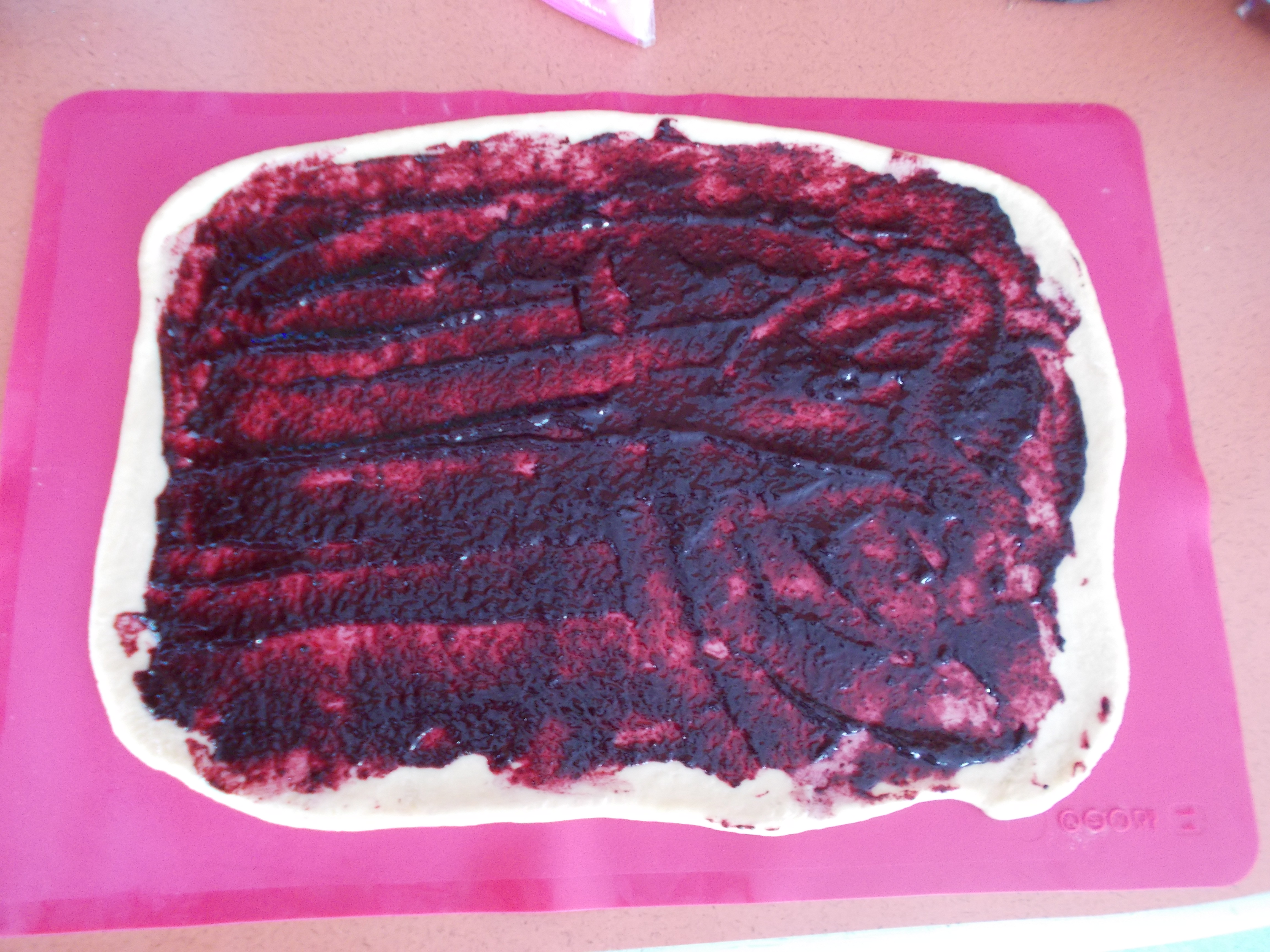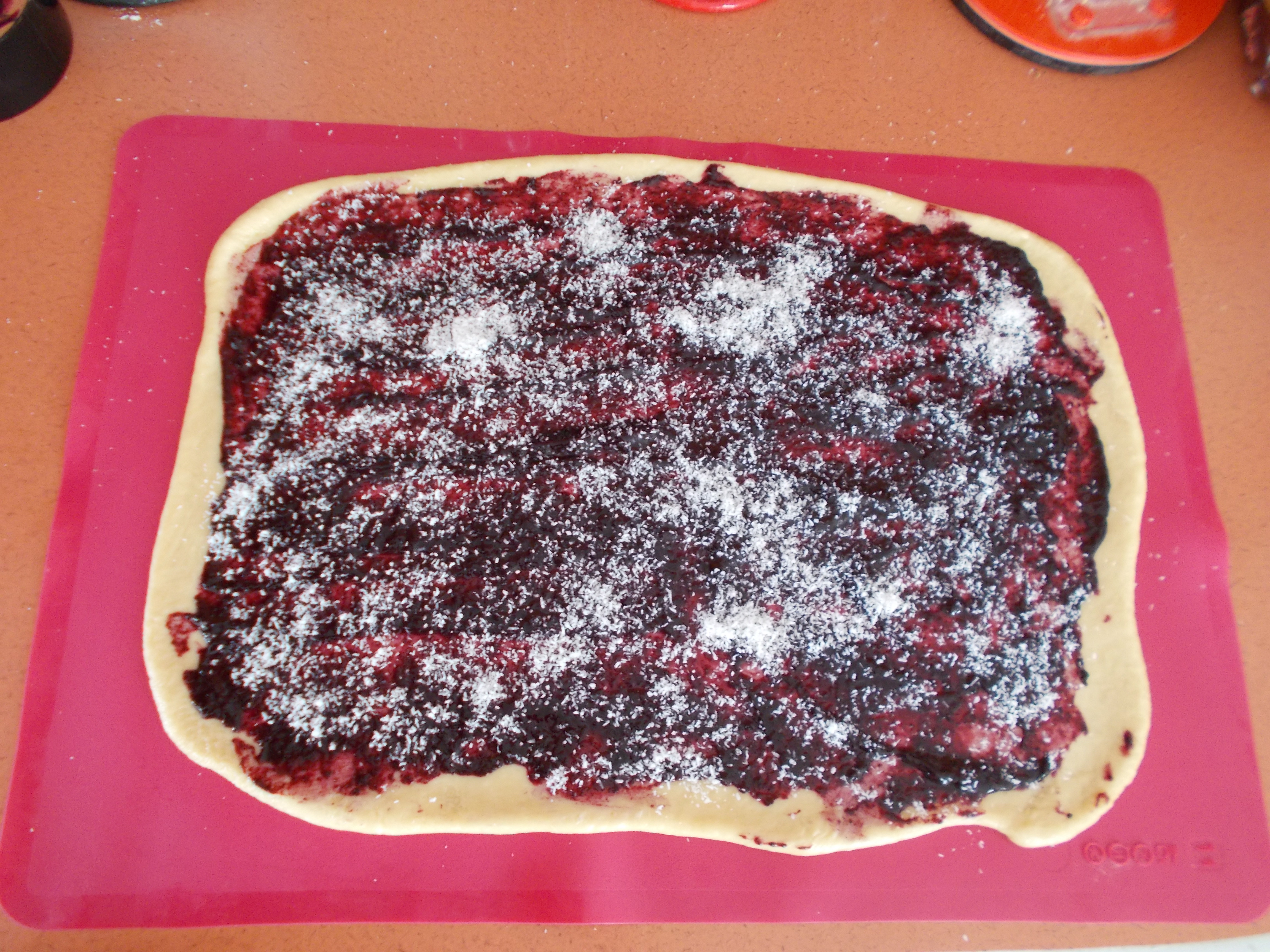 - Tartinez la pâte avec la confiture de myrtilles puis saupoudrez avec la noix de coco râpée.