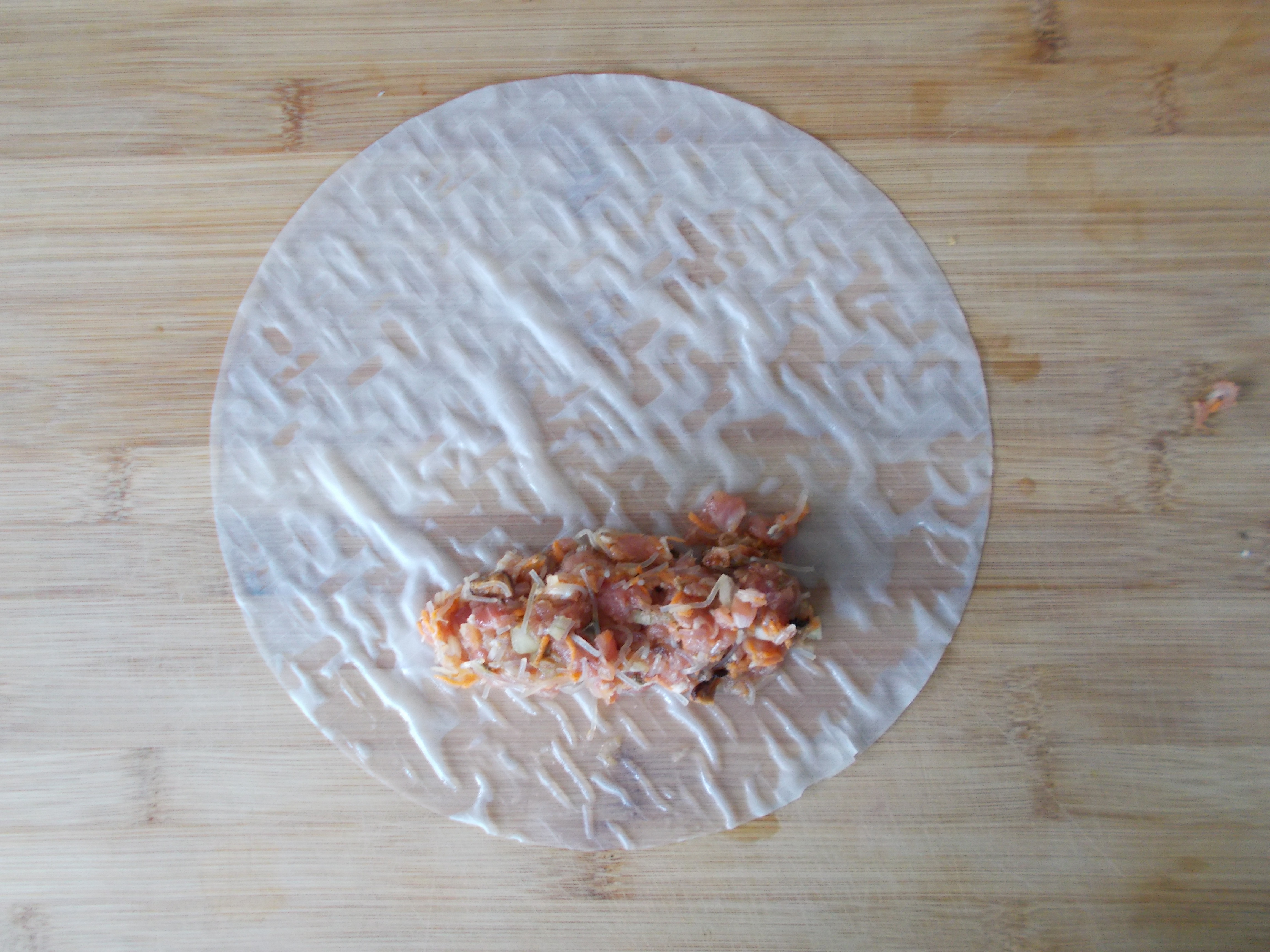 - Puis pliez la partie basse de la feuille de riz sur la farce et roulez pour former un cigare.