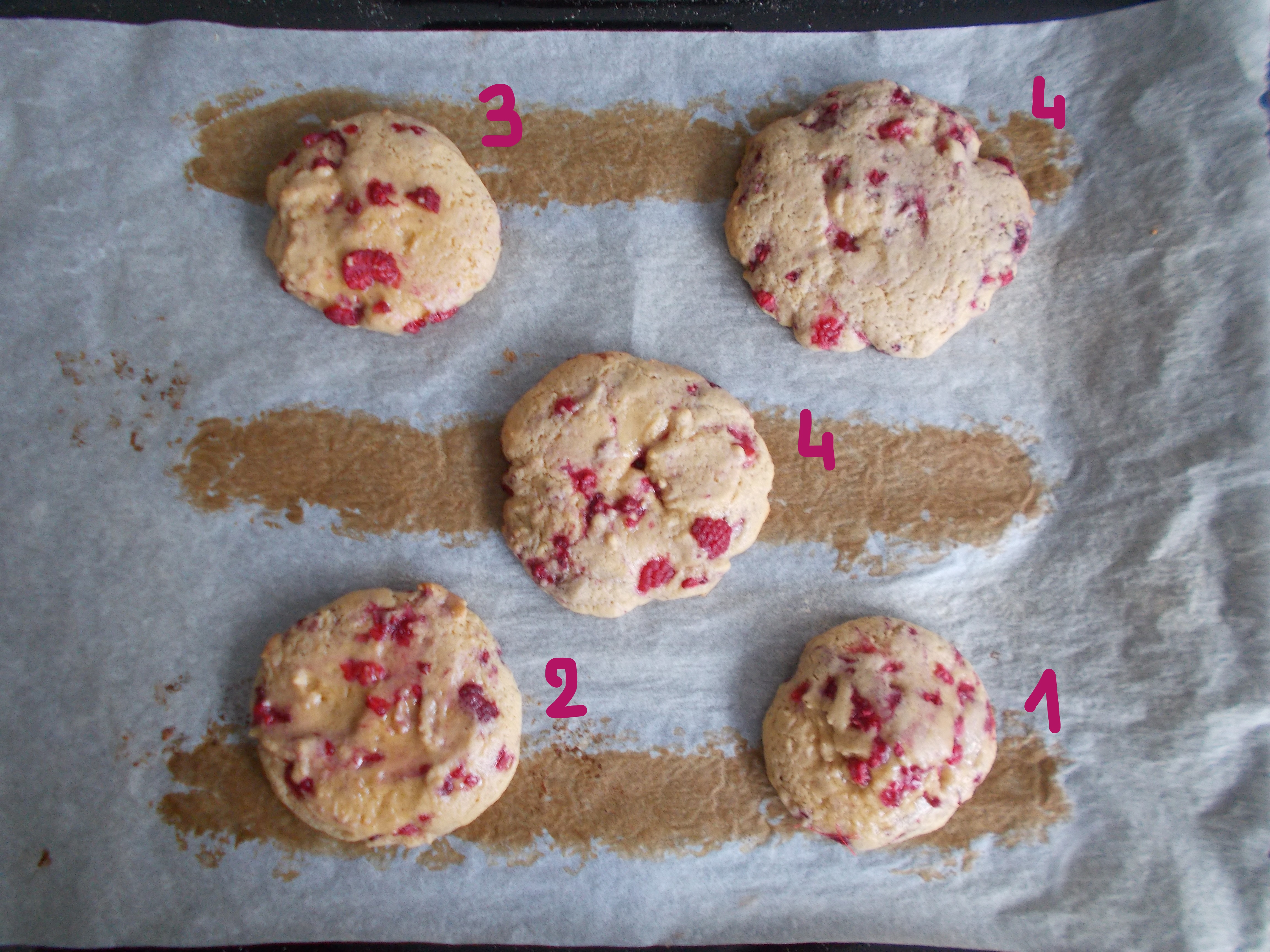 Si vous voulez éviter les traînées rouges partout dans la pâte, il est primordial d’utiliser des framboises surgelées. Congelez vos framboises, émiettez les puis replacez les aux congélateurs jusqu’au moment de les incorporer à la pâte à cookie.