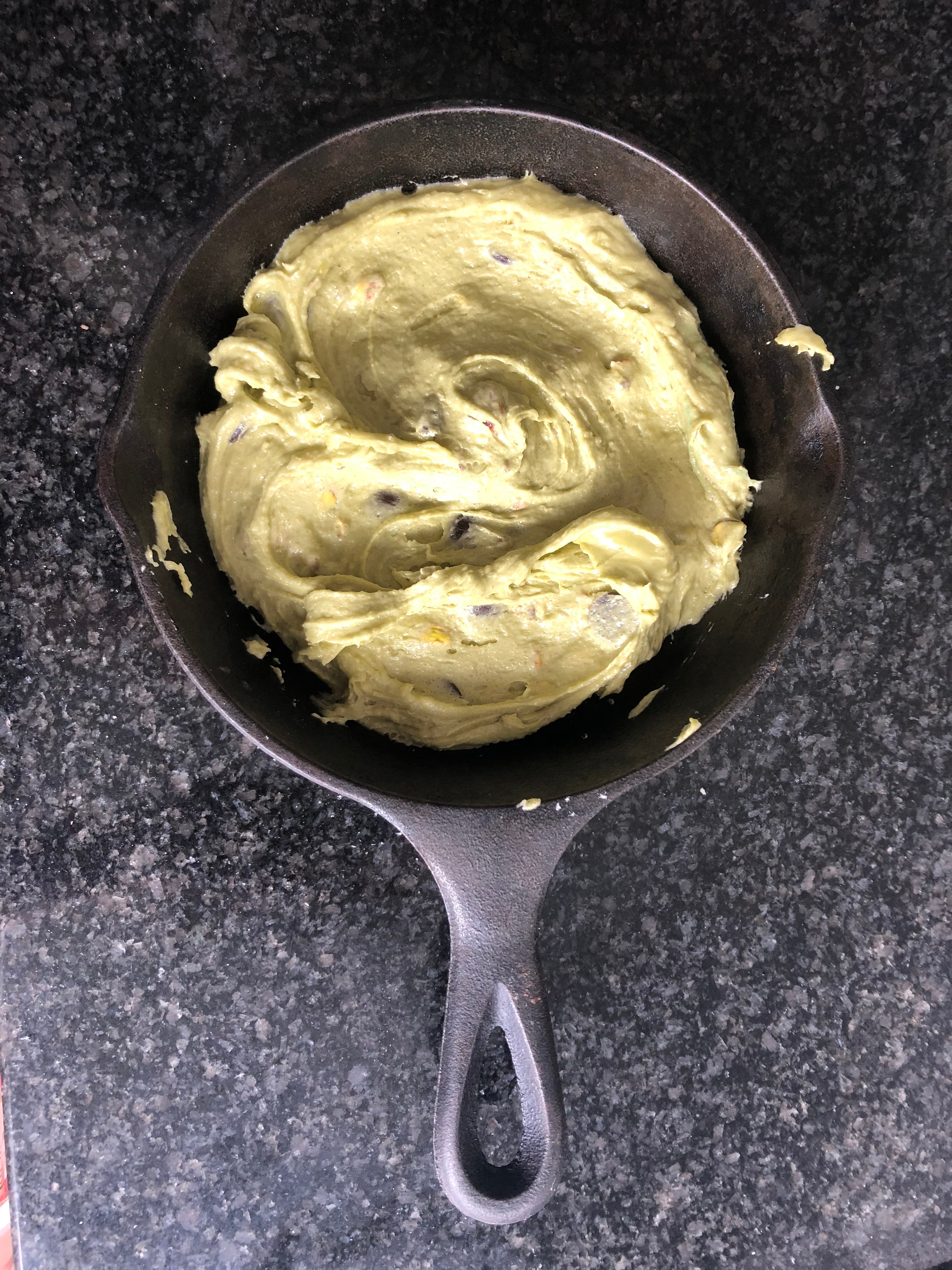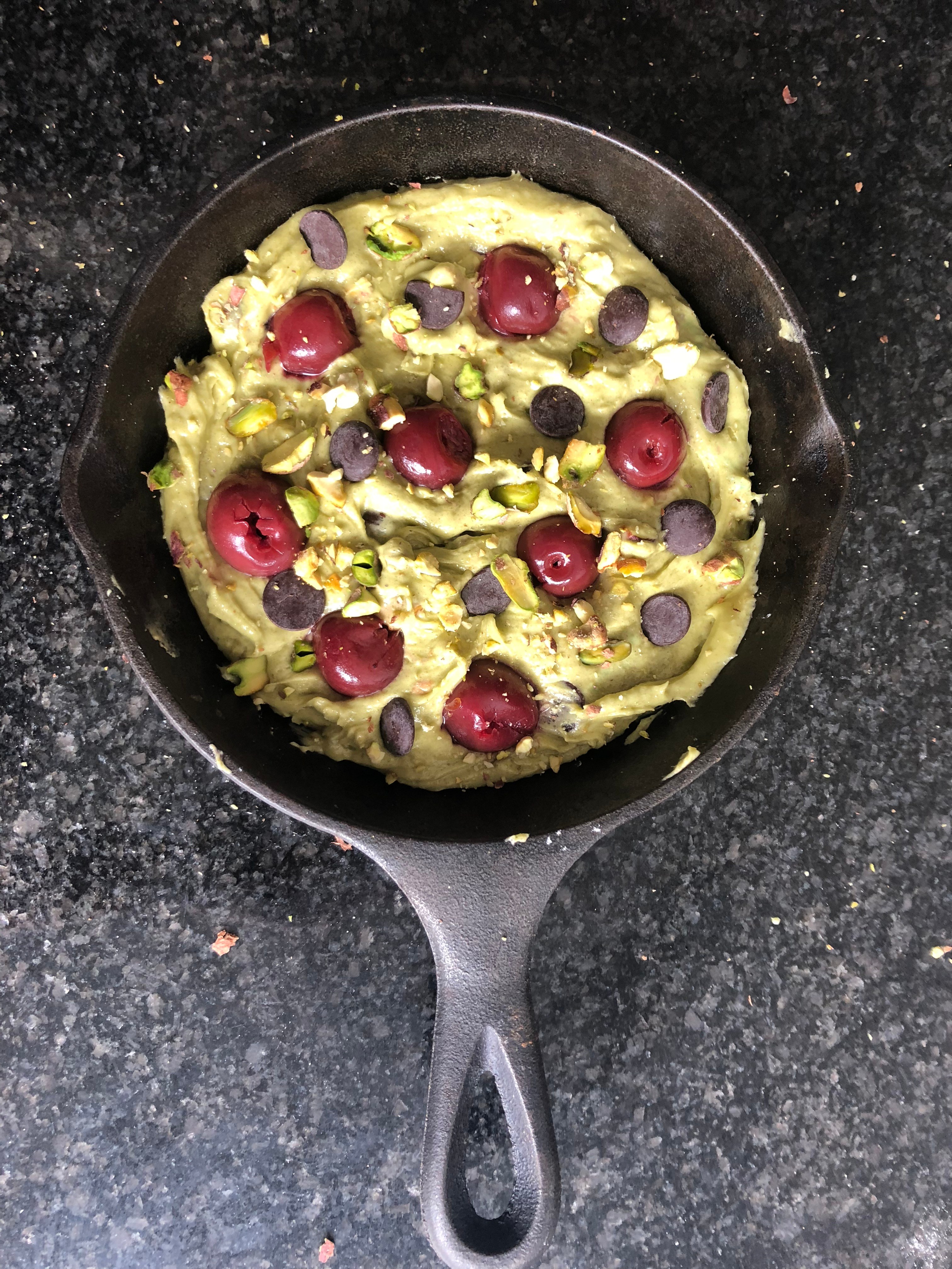 - Versez cette pâte dans un petit moule de 14 à 16 cm de diamètre. Enfoncez les cerises dans la pâte et parsemez des pistaches et pépites restantes.