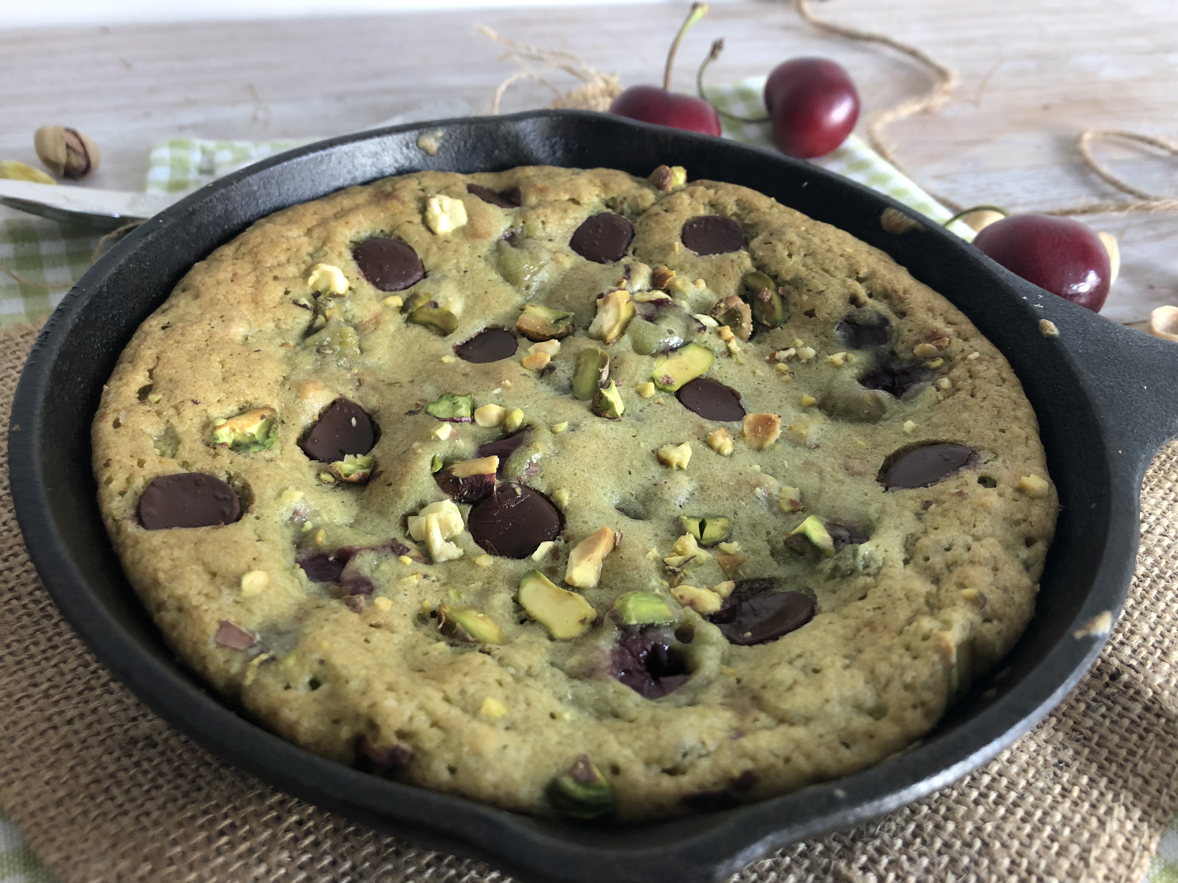 Pour faire honneur à l’été et aux premières cerises sur les étals, je suis partie sur un cookie fruité et gourmand à base de cerise, de pistache et de pépites de chocolat. Si la saison des cerises n’est pas encore là ou la qualité pas au rendez-vous, je vous suggère d’avoir recours à des cerises au sirop.